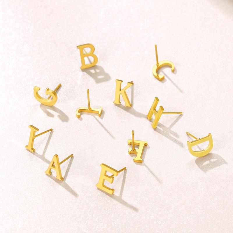 Discover FindChic's Initial Earrings set, featuring three pairs of Golden stainless steel studs with black letter design. A versatile and thoughtful gift suitable for any occasion, perfect for men and women.