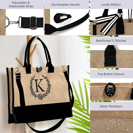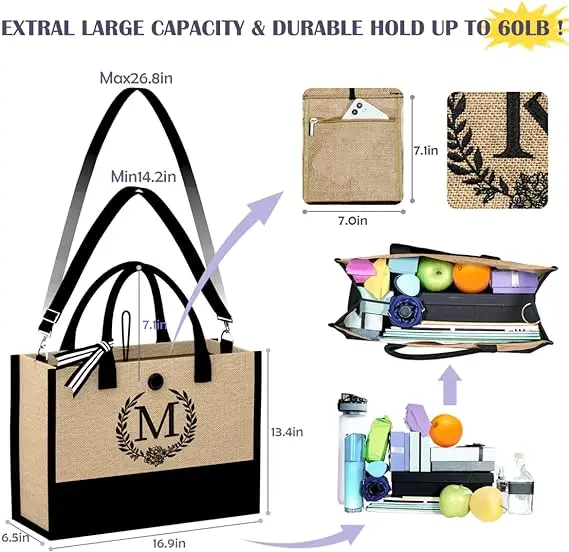 ·PREMIUM MATERIAL & DURABLE: The jute bag body is made of heavy-duty 100% 14oz natural jute fiber, the handle and strap use soft natural cotton, plus woven by high-density weaving craft to ensure durability, and it can load more than 60 lbs., much sturdy than other competitors. More giftable for the letters are embroidered instead of printed