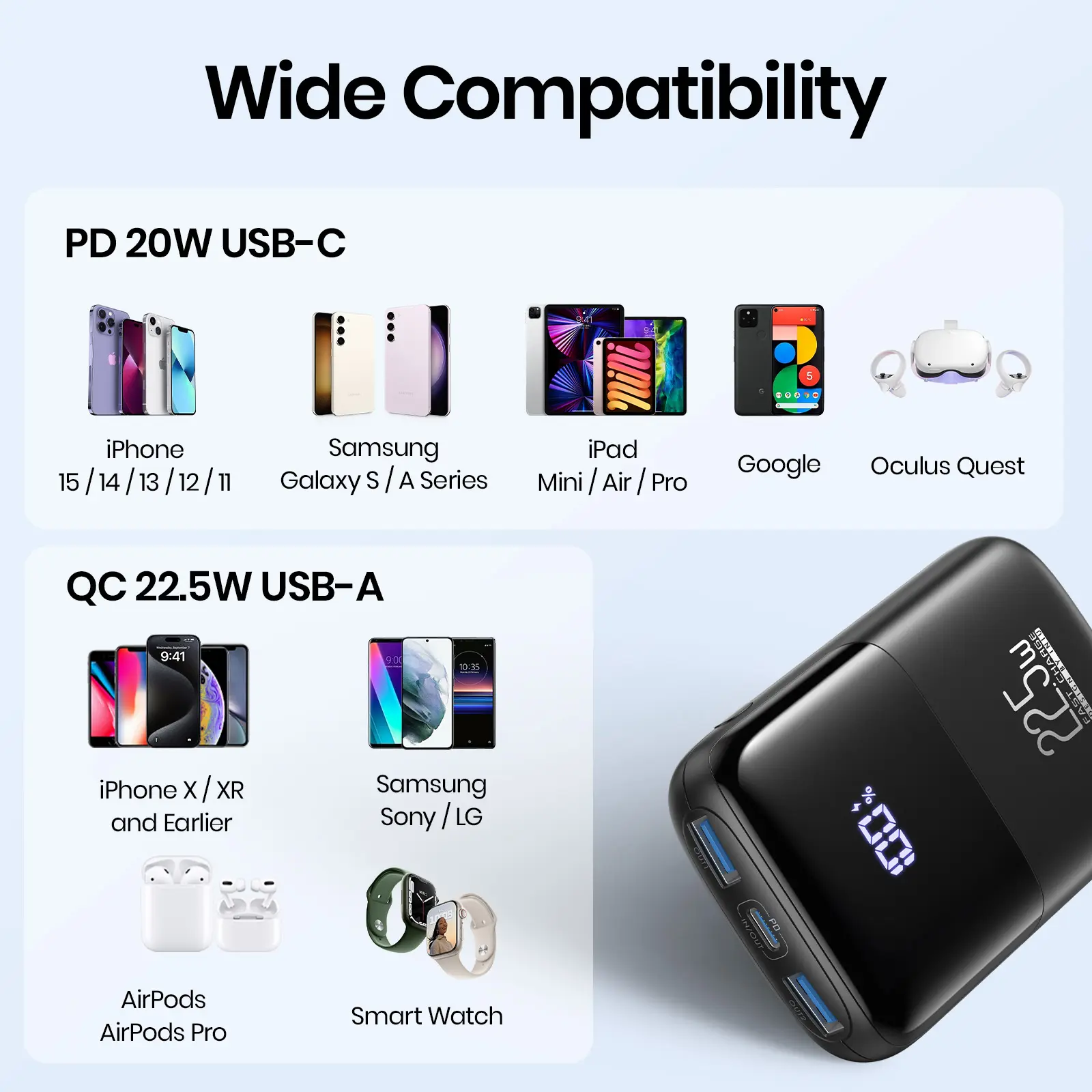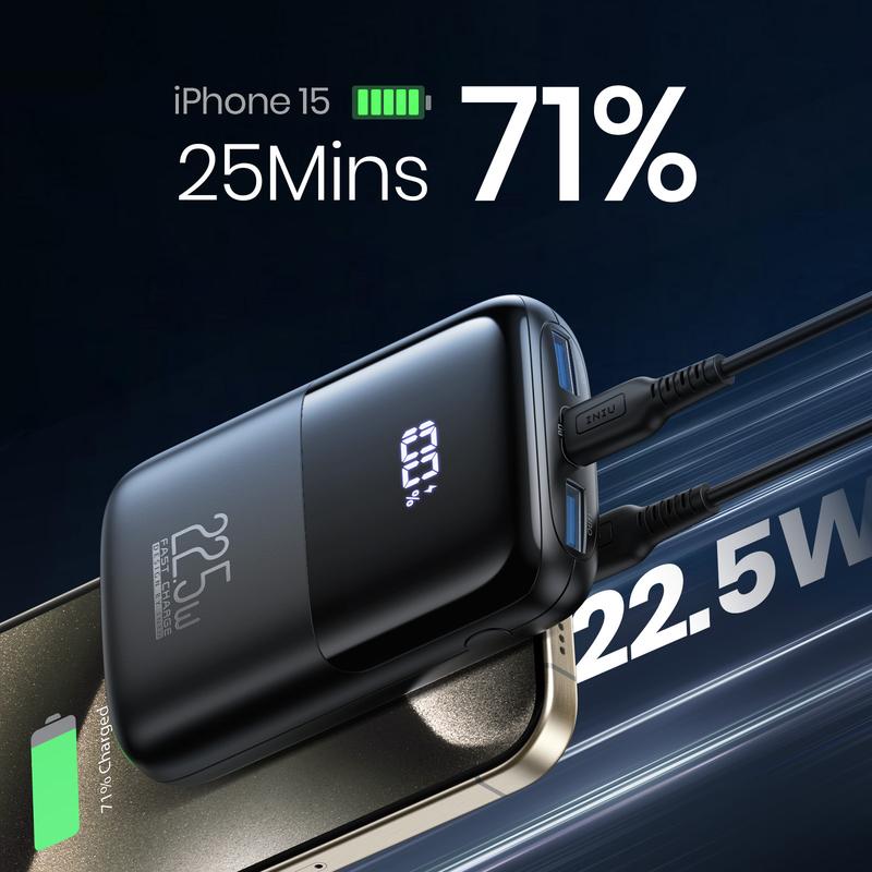 INIU's 22.5W power bank combines PD 3.0 & QC 4+ tech. Charge your iPhone from 0 to 60% in 30 mins, nearly twice as fast as 2.4A chargers.