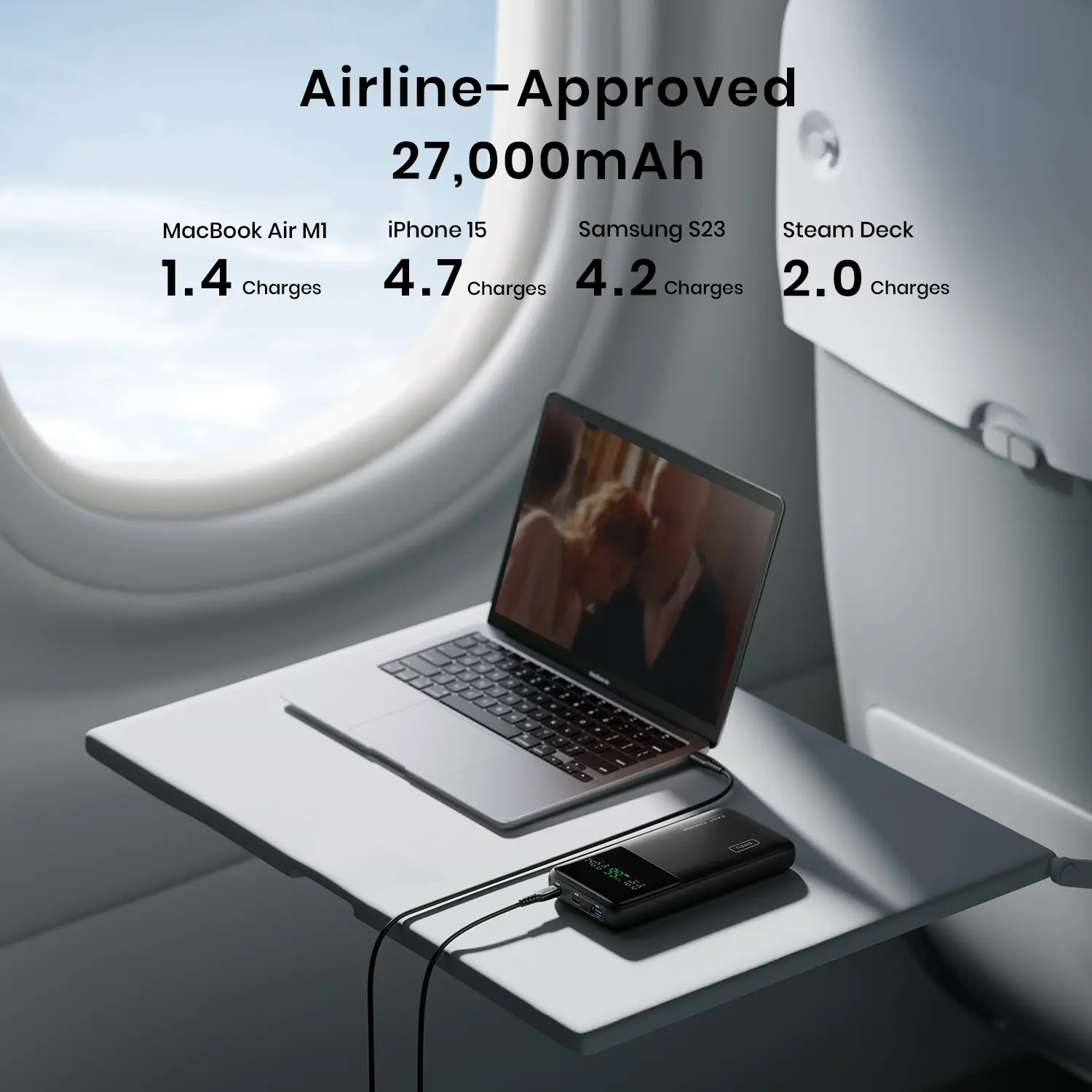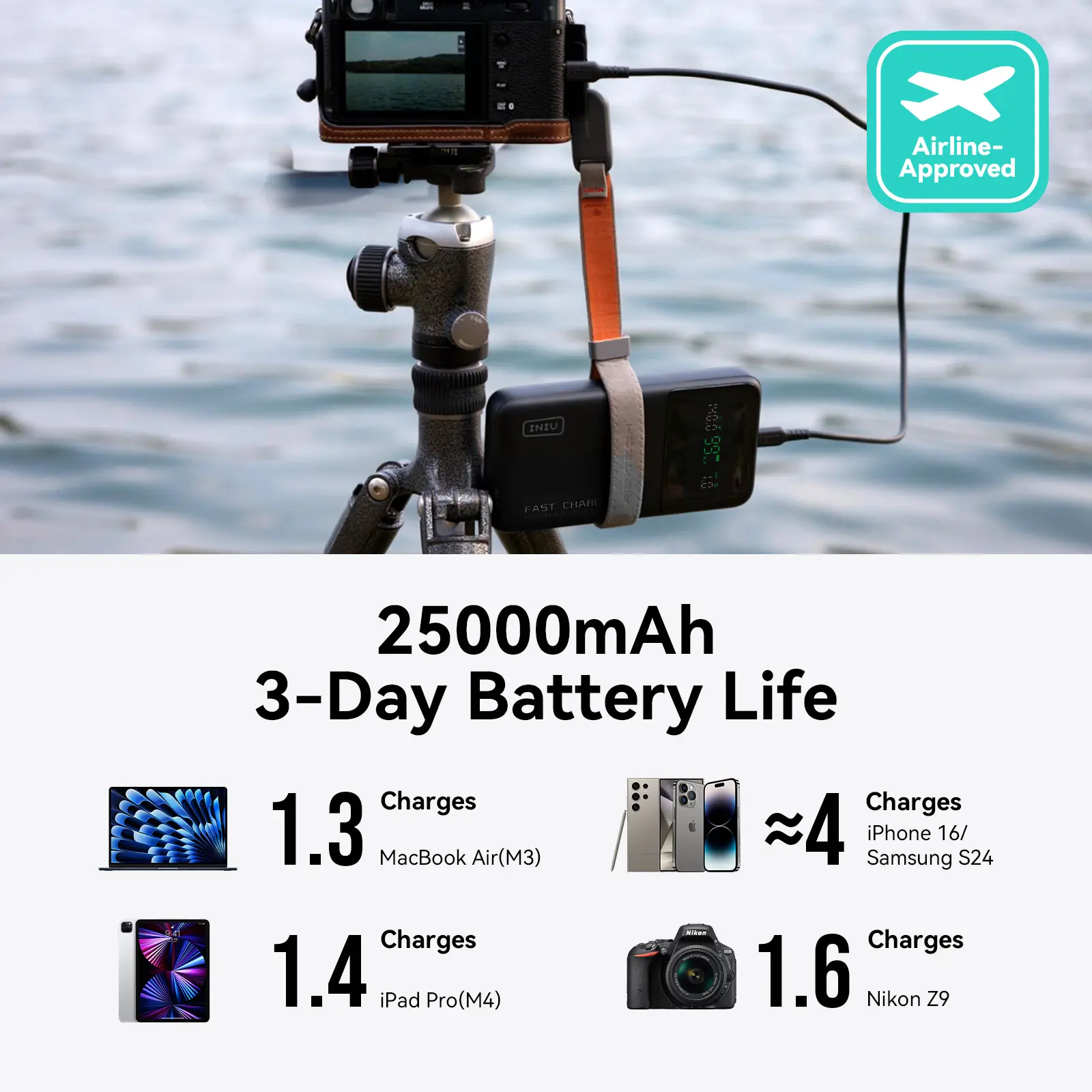 ·【Massive Airline-Approved 25,000mAh】 With a whopping airline-approved 27,000mAh battery capacity, it gets multiple charges for all your devices on the go in recharge once. You'll be amazed at how infrequently you'll need to recharge it - just once for 10-day use!