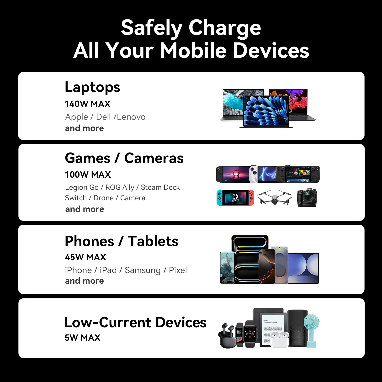 ·【Power 1,000+ Devices from Big to Small】 Whether you have an Android, Apple, or another brand of device, this charger's got you covered. A universal solution for all your charging needs.