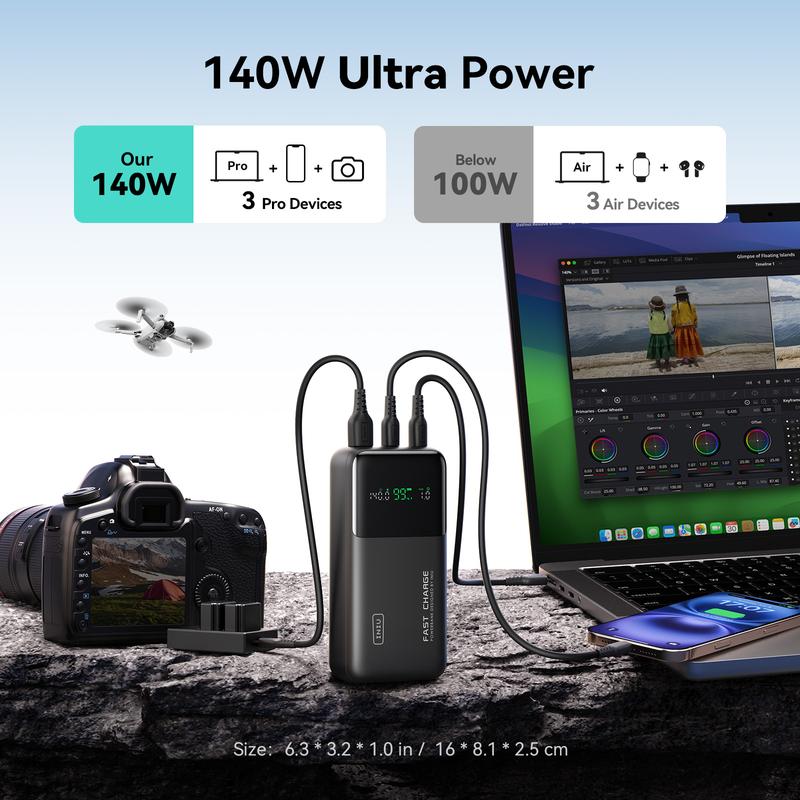 ·【Charge 3 at Once】 With 3 charging ports, including a blazing-fast PD 3.1 140W USB-C in/out port, a PD 45W USB-C fast charging port, and a trusty USB-A port, this power bank is your all-in-one charging solution. It works seamlessly with various cable types, ensuring rapid charging for all your devices.