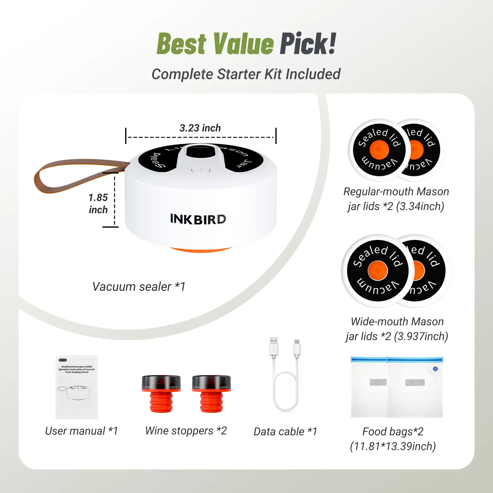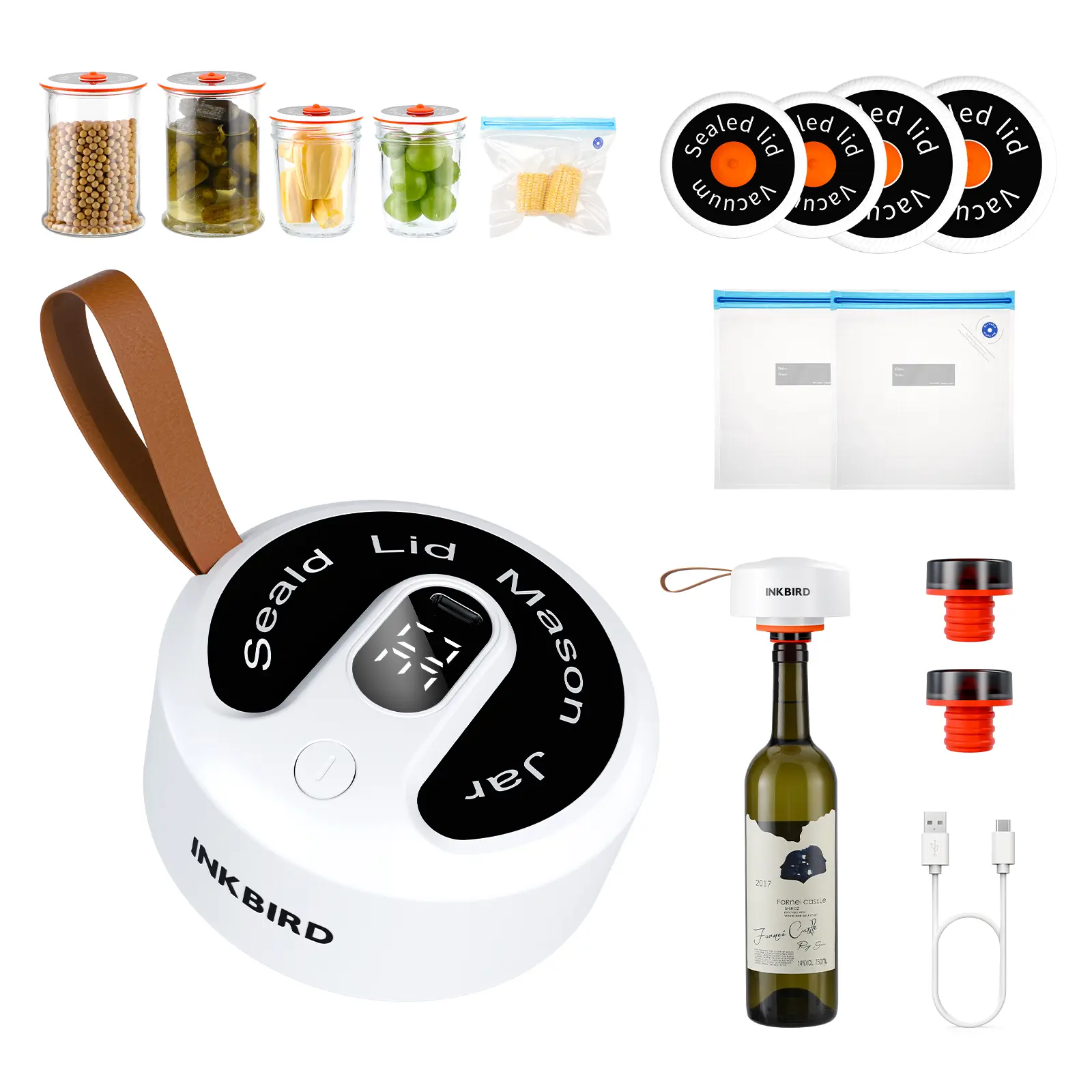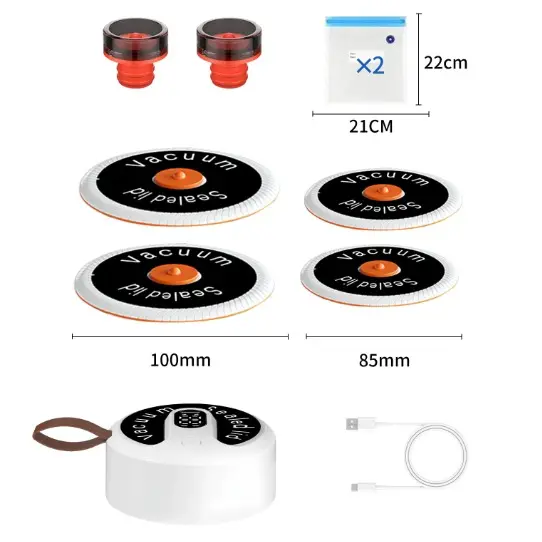 ·Includes: Handheld Vacuum Sealer, Wide-mouth Mason Jar Lids, Regular-mouth Mason Jar Lids, Food Bags, Wine Stoppers, USB Cable, User Manual.