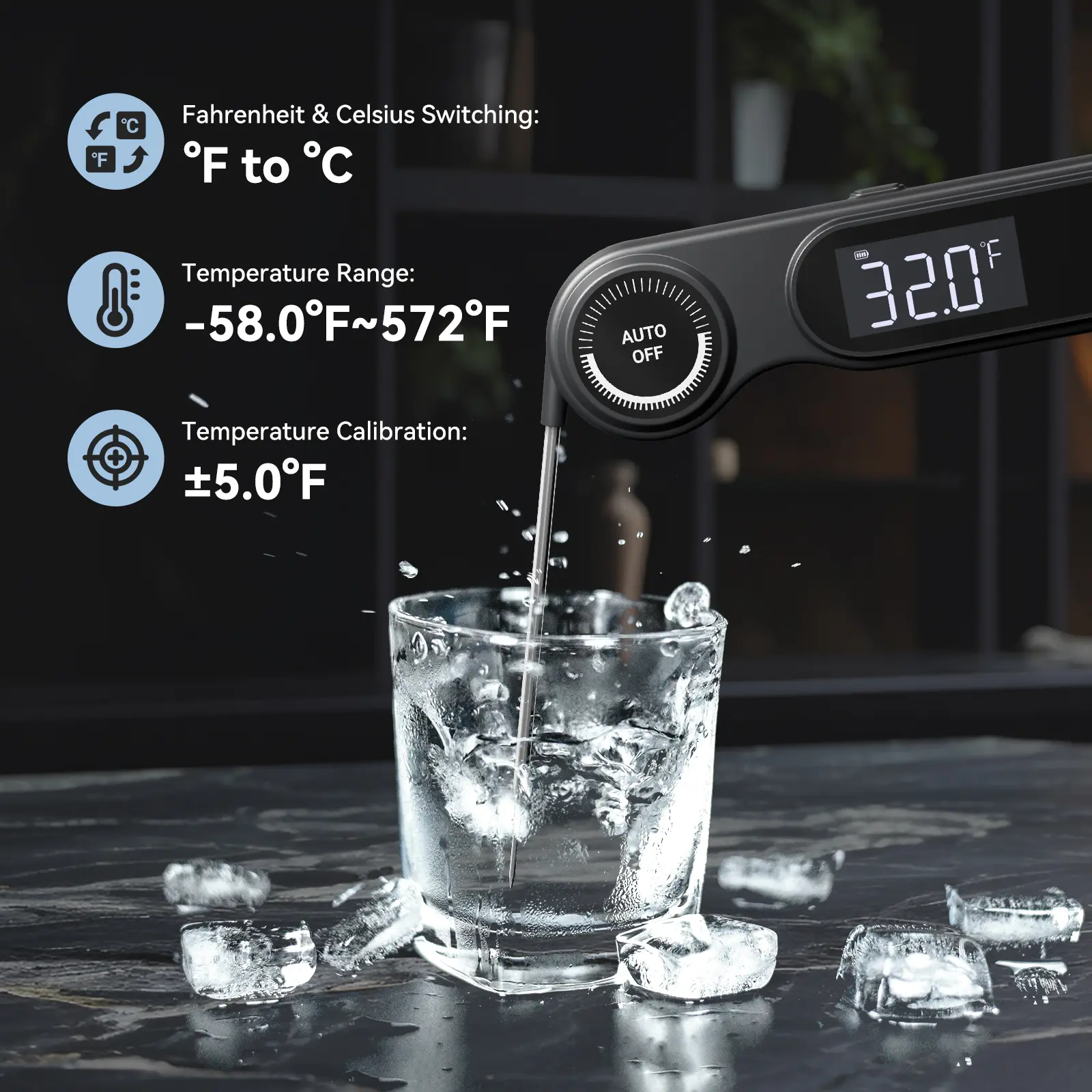 Wide Range of Application: This instant-read meat thermometer has an extremely wide temperature measurement range of -58.0℉ to 572℉ (-50.0℃ to 300℃), making it ideal for a variety of cooking applications, including pan frying, deep frying, baking, home brewing and making beverages