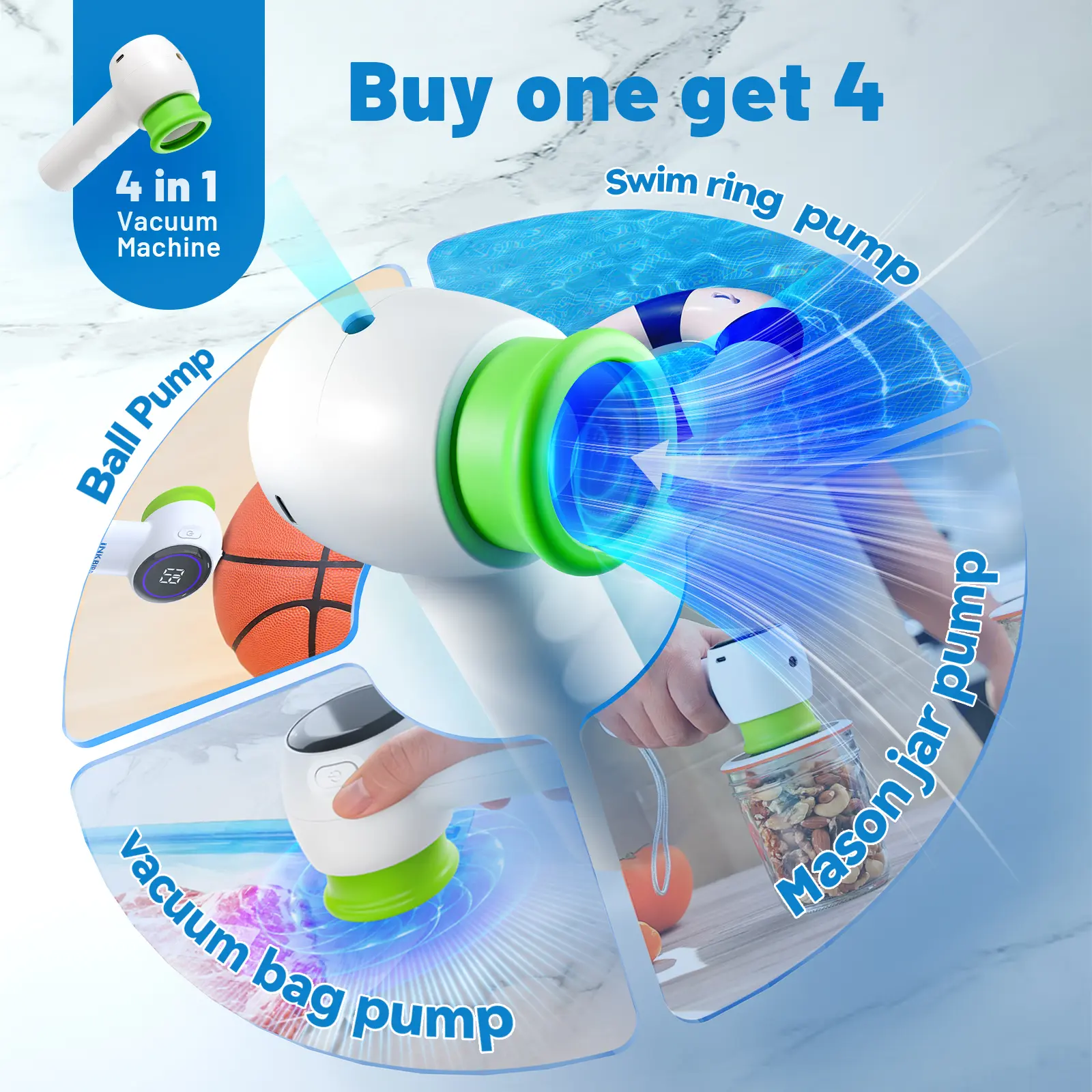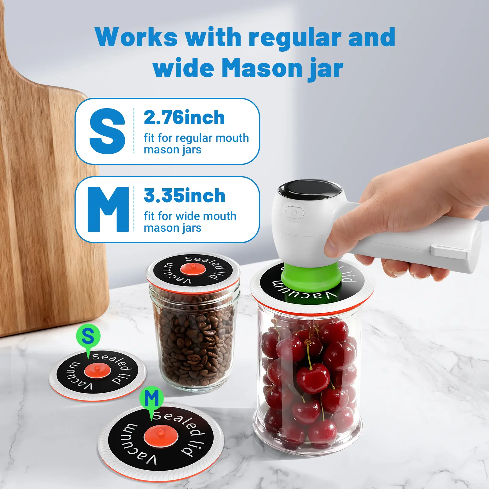 ·4-in-1 Mode: Suitable for 3 types of mason jars and vacuum food storage bags.