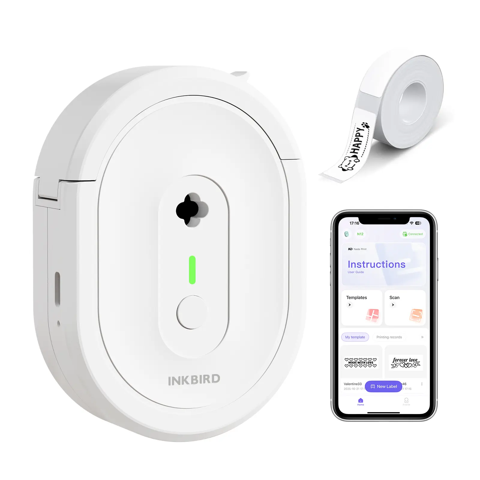 The INKBIRD N12 is a lightweight label maker, perfect for home, school, and office use. It features Bluetooth connectivity for smartphone operation. The thermal printing technology eliminates the need for ink or toner, making it eco-friendly and energy-efficient. Ensure text and graphics are within the red border for optimal print quality. The built-in 1200mAh rechargeable battery ensures sufficient power.