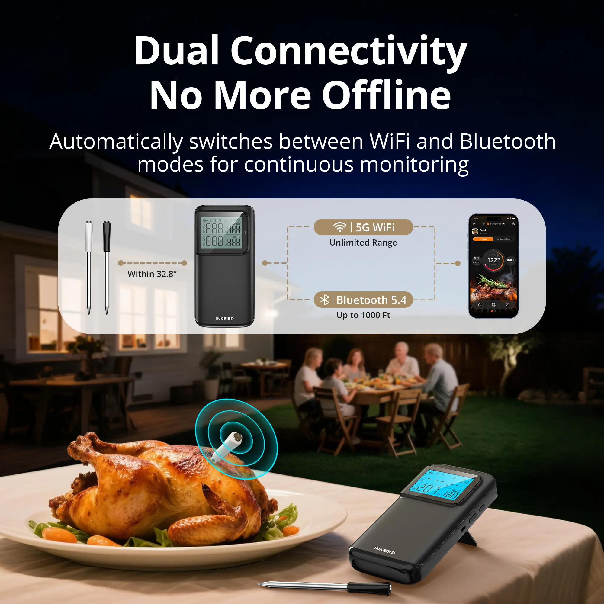 ·WiFi 5G & Bluetooth 5.4: Dual-mode connectivity for seamless monitoring. Monitor from up to 305 m/1000 ft indoors and switch to WiFi outdoors.