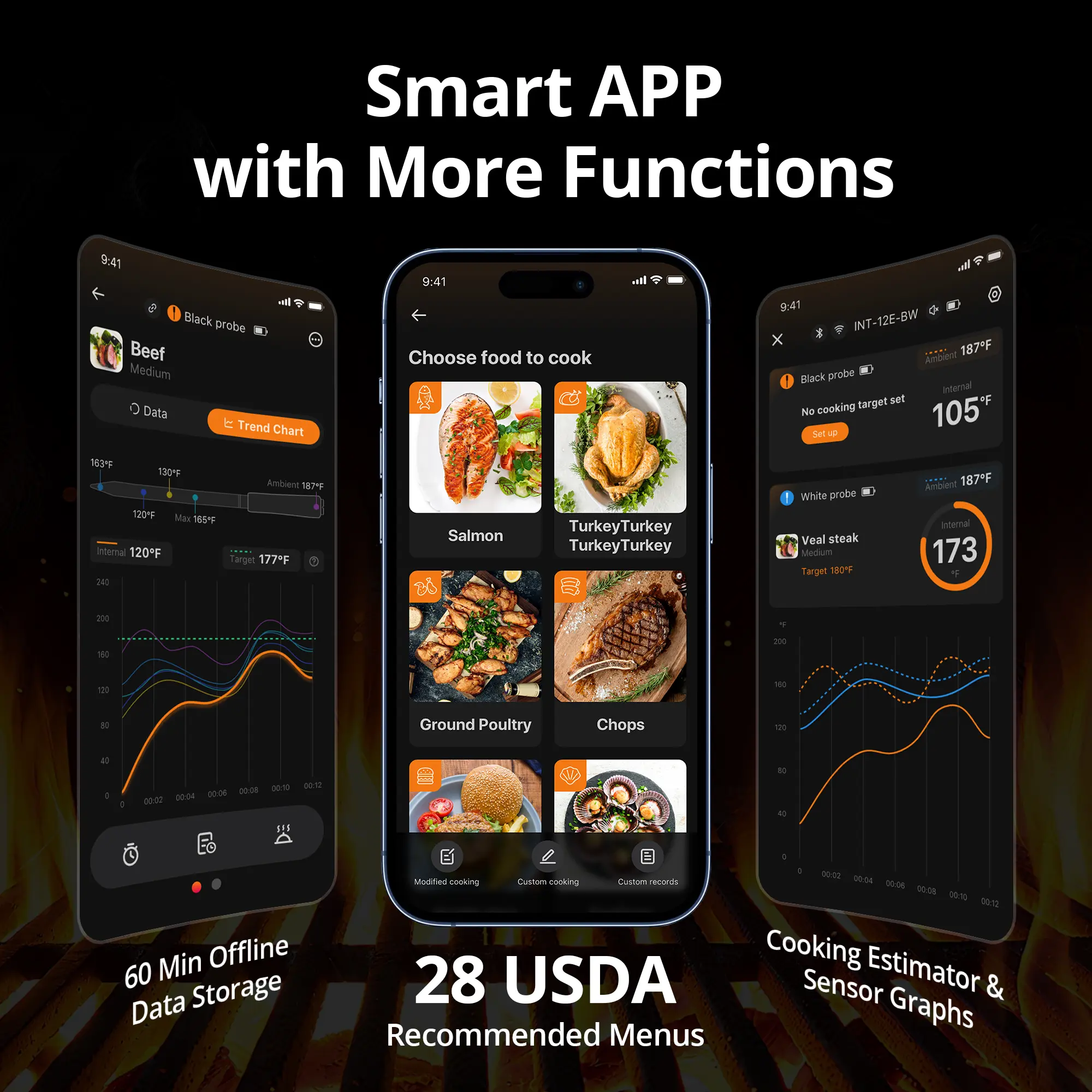 ·High & Low Temperature Alarms: Real-time alerts for food and oven temperatures to prevent overcooking.