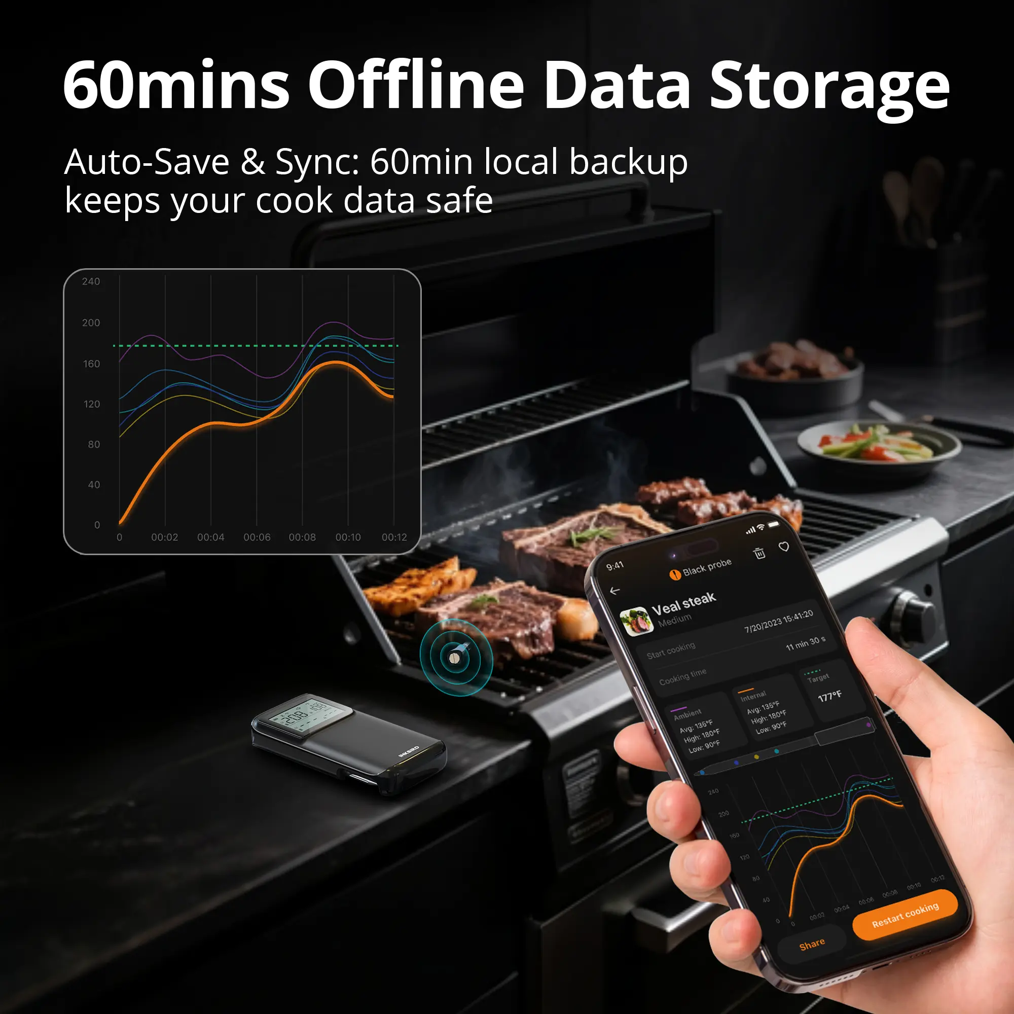 ·5 High Precision Sensors: Each probe has 4 food sensors and 1 ambient sensor for accurate temperature control.