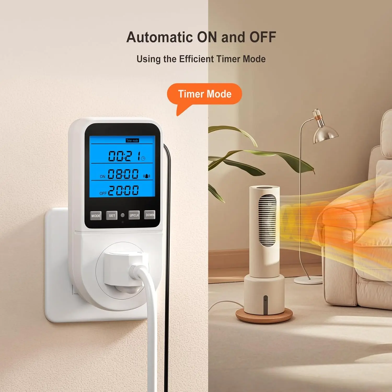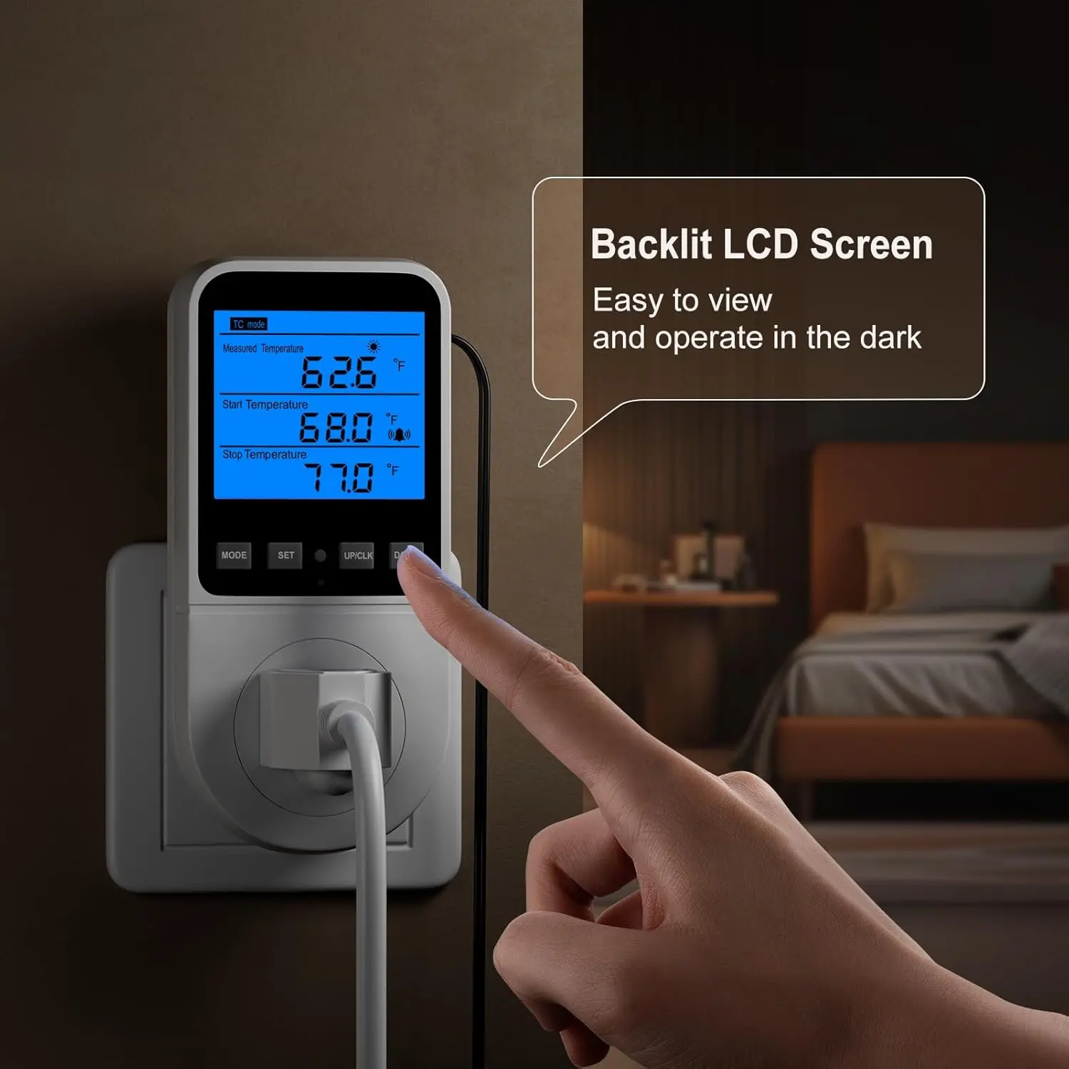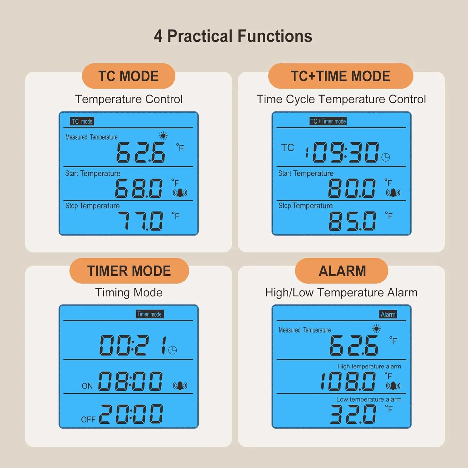 This thermostat offers 3 distinct time periods with varying temperature control ranges. Choose between Heating or Cooling modes. The Timer Mode allows you to set start and stop times, ensuring automatic cycling daily. Perfect for greenhouse, reptile, and incubator needs.