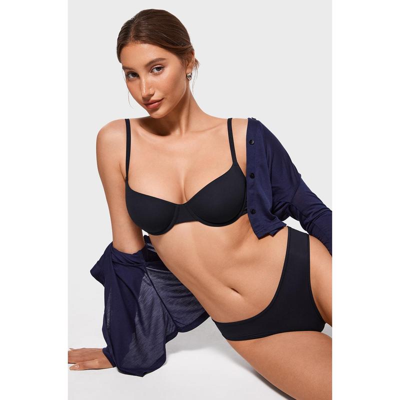 Material is thick and soft! Super comfortable even though it has underwire