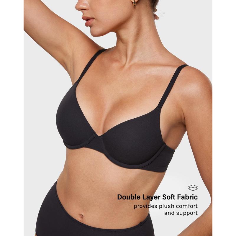 The fit is great! The underwire is there but can’t feel it much when wearing. The cup part is just fabric not a padded material. When wearing with tight shirts the bra is pretty much invisible!