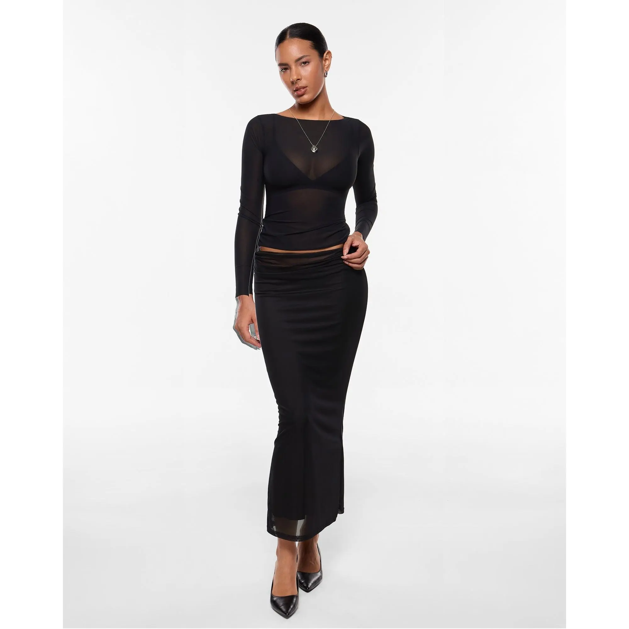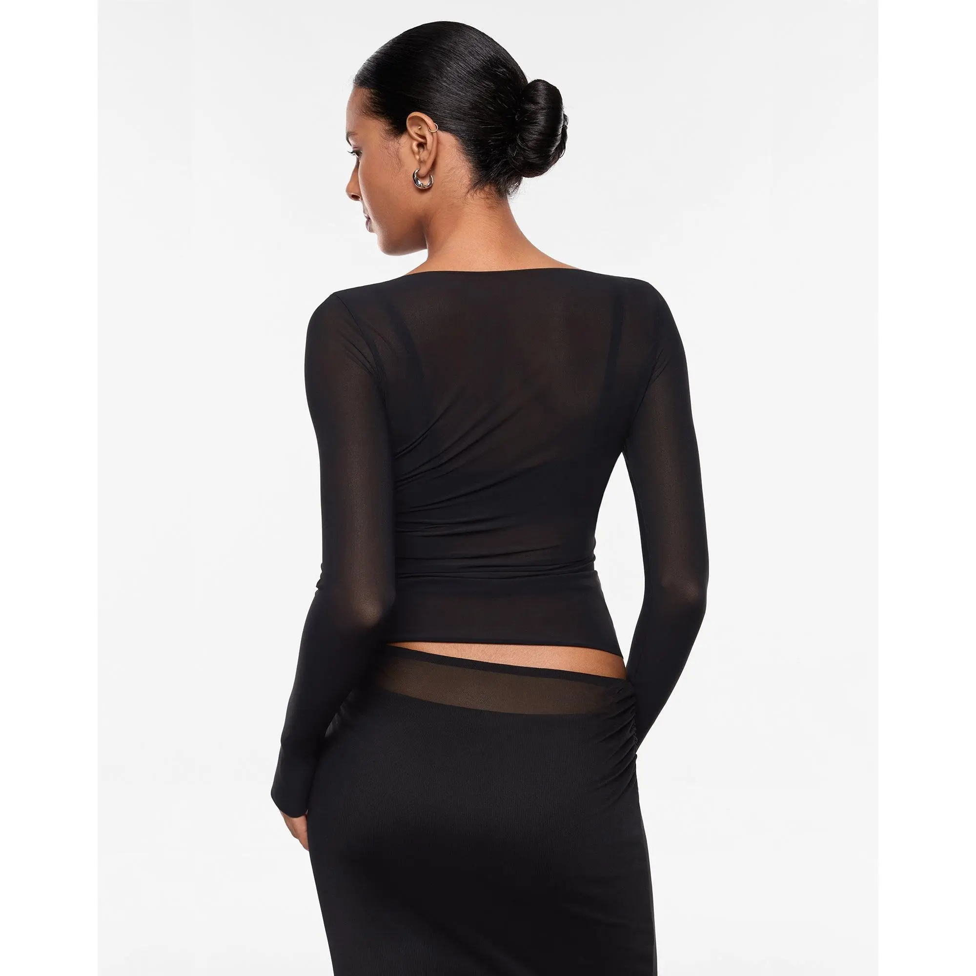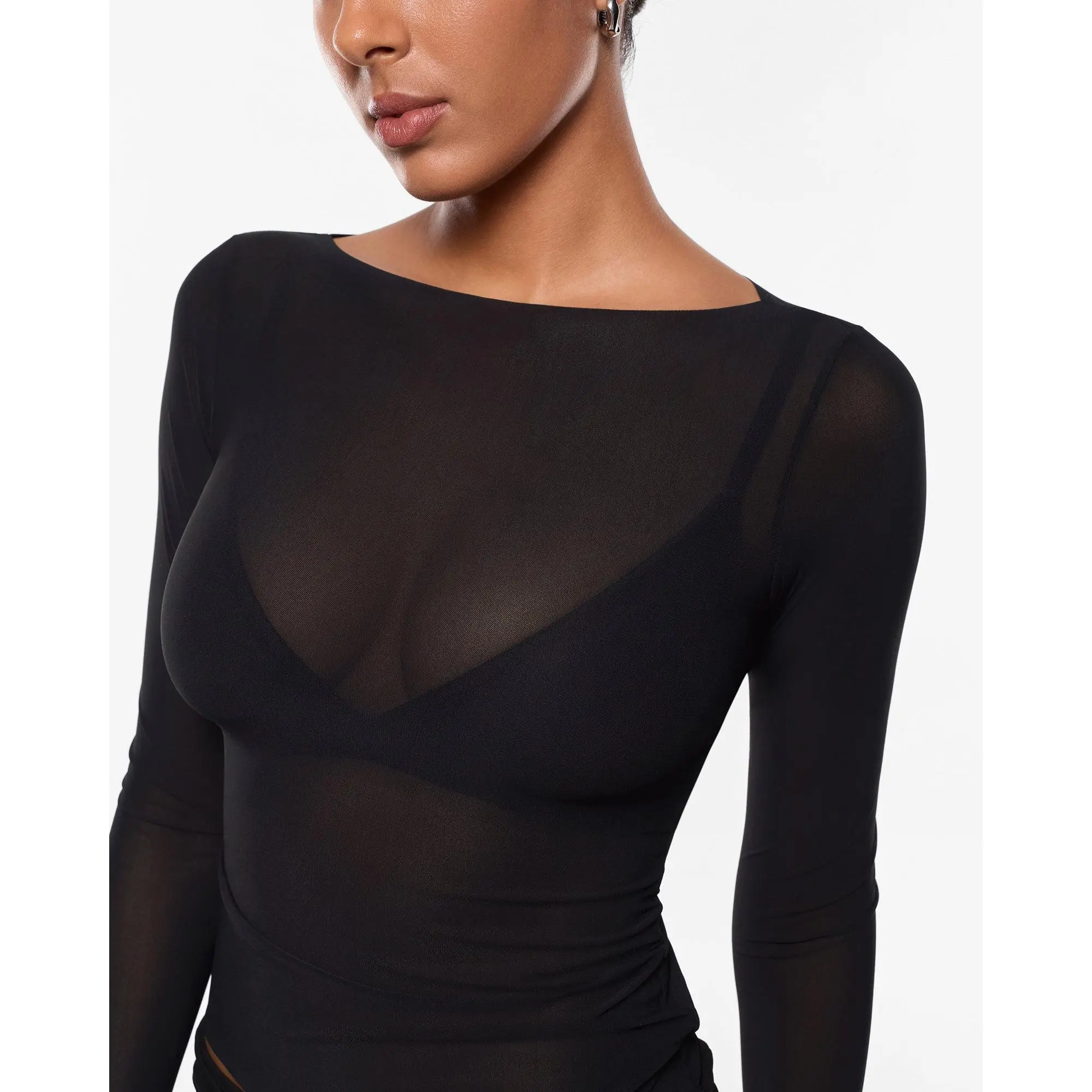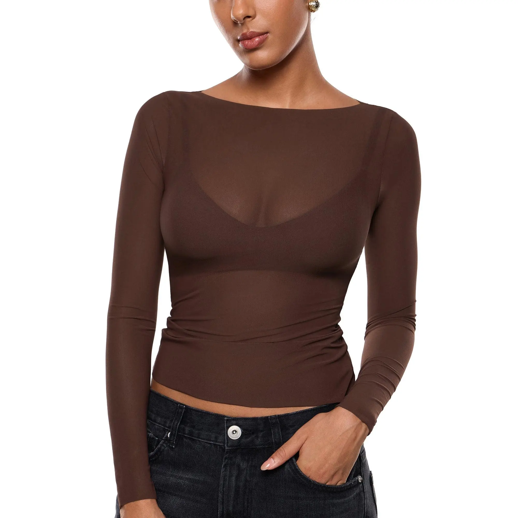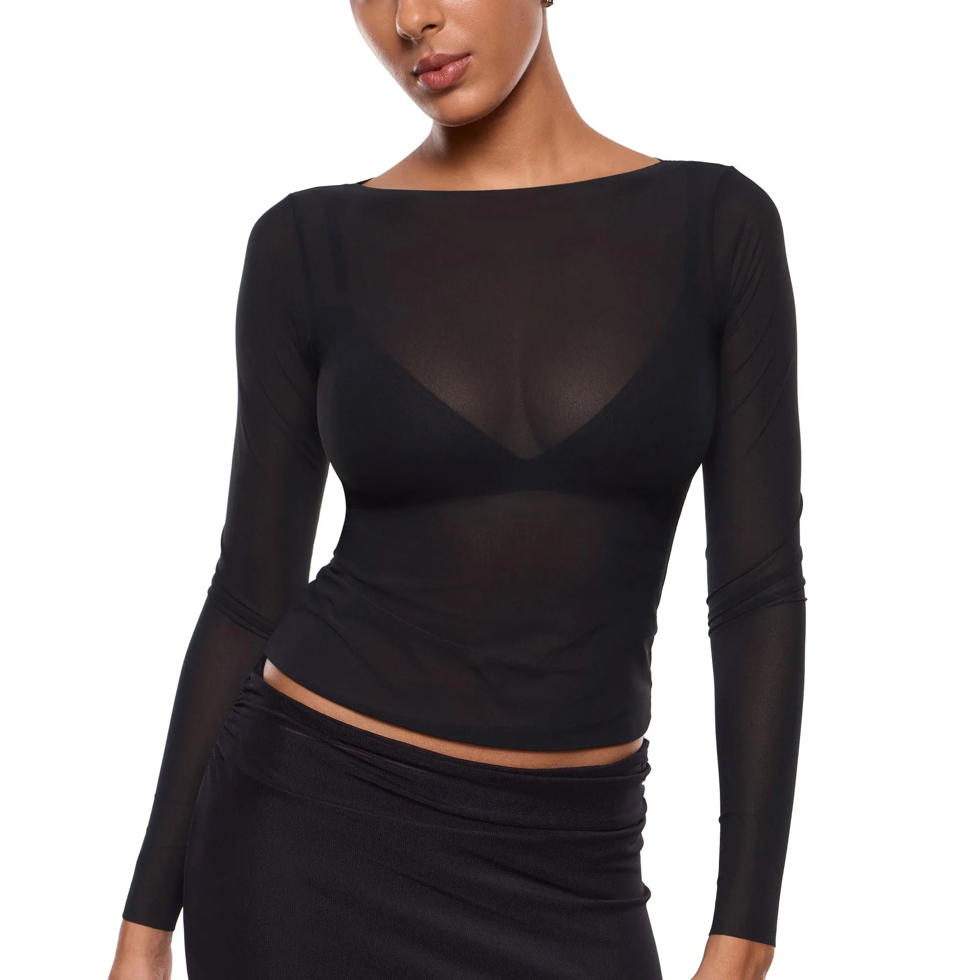 ·Design: Boat neck top with a sheer fabric design, perfect for a feminine look.
