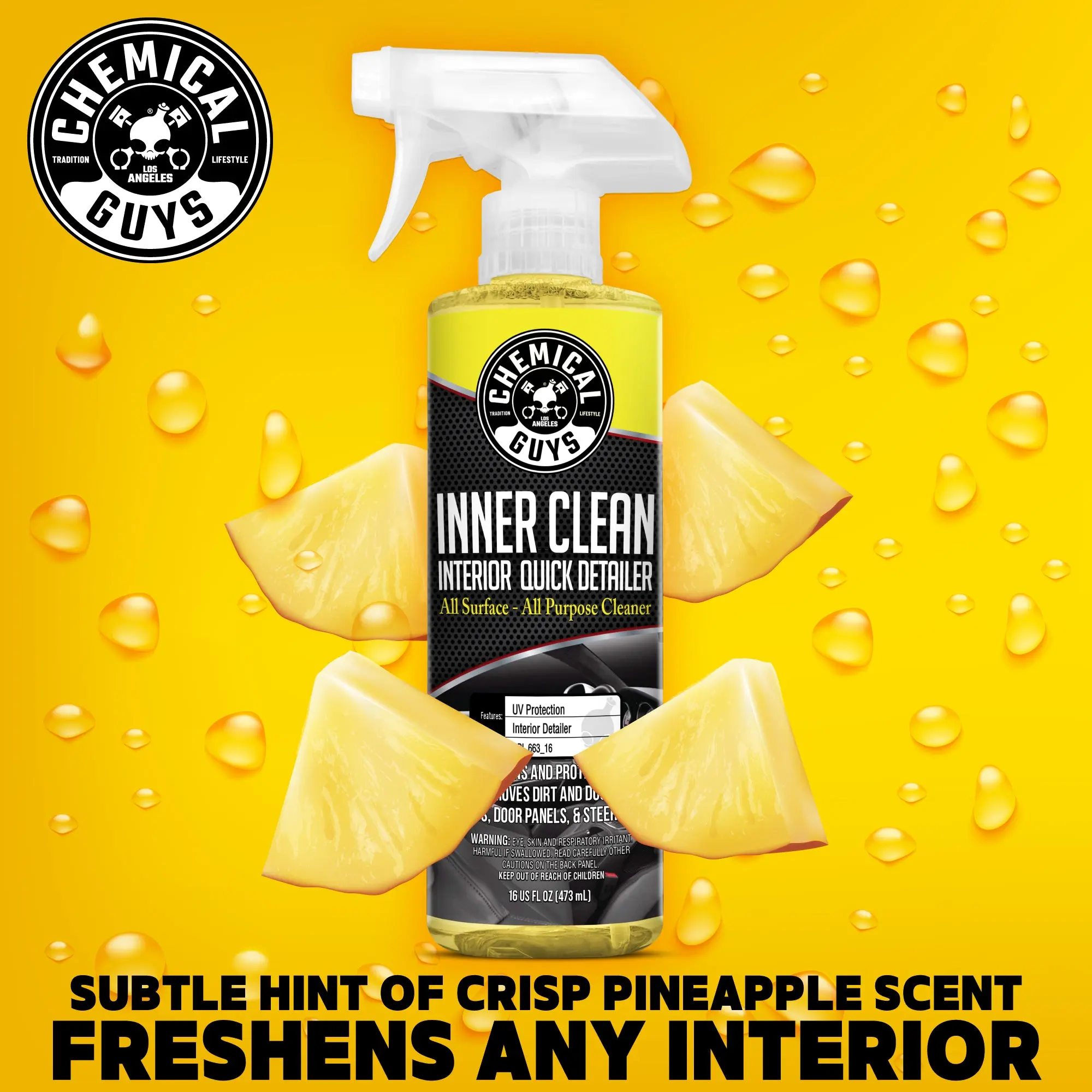 Without proper protection against harsh UV sunlight, plastic and vinyl parts can crack and fade. Treating interior surfaces with Inner Clean infuses them with premium sunblockers and UV rejectors to protect them from degradation due to sunlight. Plus, Inner Clean freshens your interior with the crisp scent of pineapple or baby powder, while enzymatic odor eliminators destroy odors at their source.