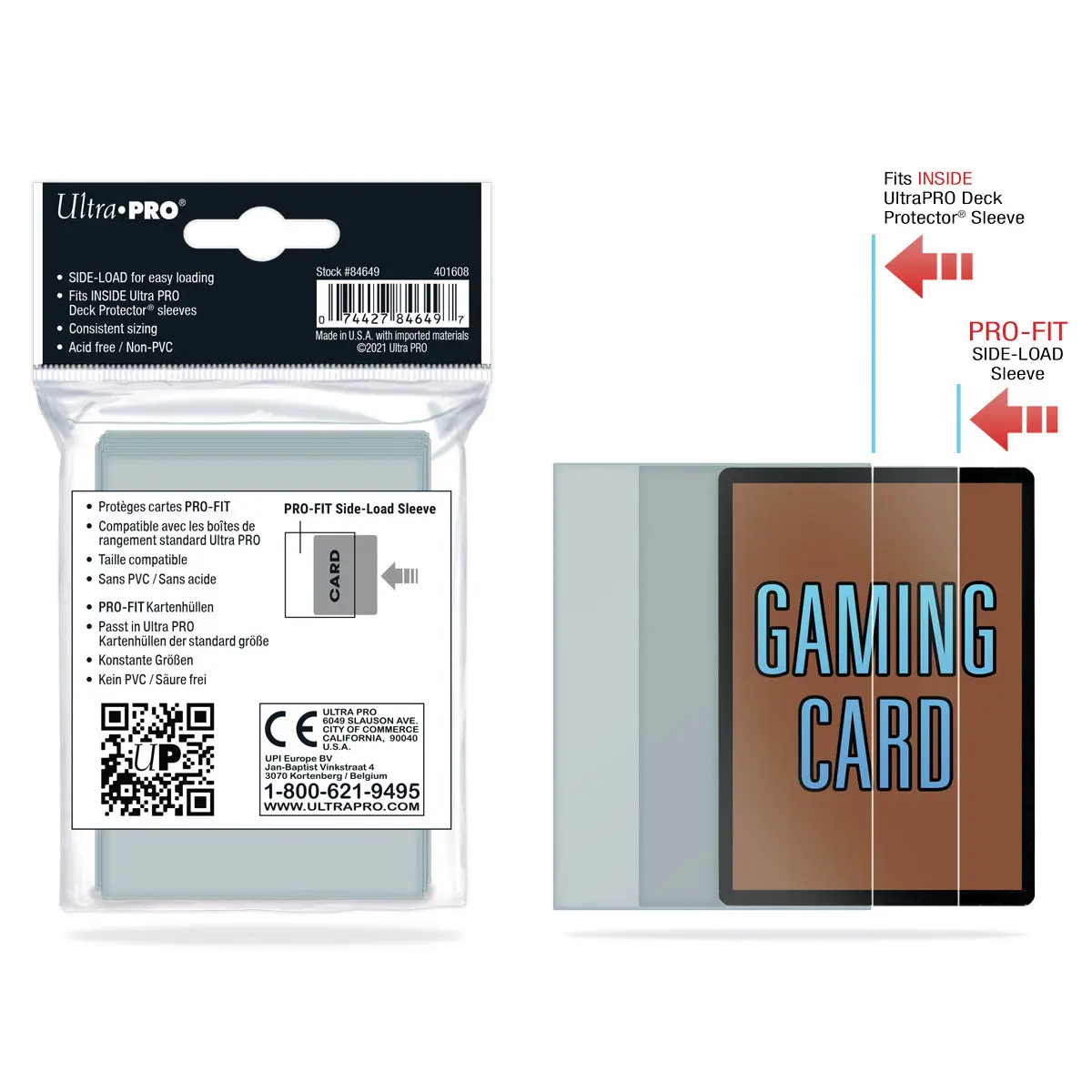 Side-loading PRO-Fit inner sleeves designed for standard (Magic) sized gaming cards. These inner sleeves fit tightly around the card to give it an extra layer of protection. PRO-Fit sleeves can also be used as a standalone sleeve to showcase the full art of the card. The standard-sized PRO-Fit sleeves can be used in conjunction with the Ultra PRO 35pt ONE-TOUCH® magnetic holder, especially recommended if the card is expected to be taken in and out of the holder frequently. Made from ultra-clear, archival-safe, and acid-free material. Do not use with sharp-angled sports cards as the tight fit may damage the corners. 100 sleeves per pack.