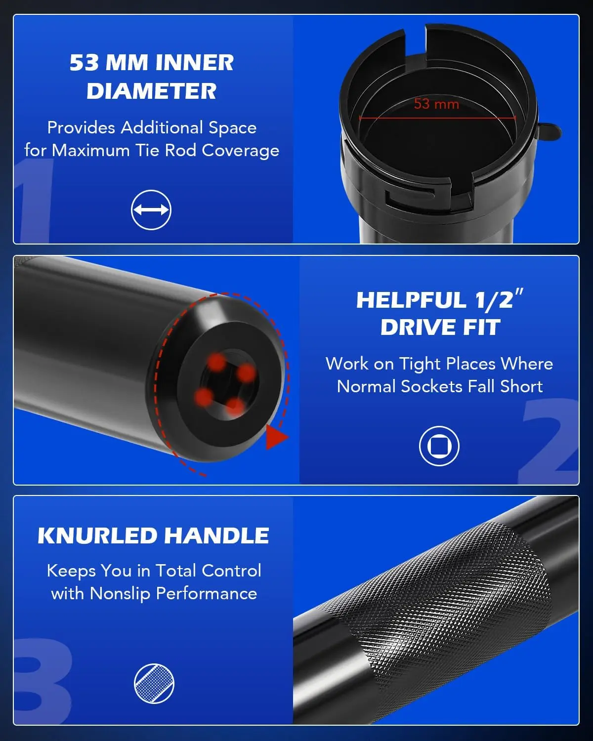 UNIQUE DESIGN: Our inner tie rod remover's 20 inch tube handle lets you remove and install inner tie rods in places where sockets and wrenches can’t fit; works on inner tie rods with inaccessible wrench flats