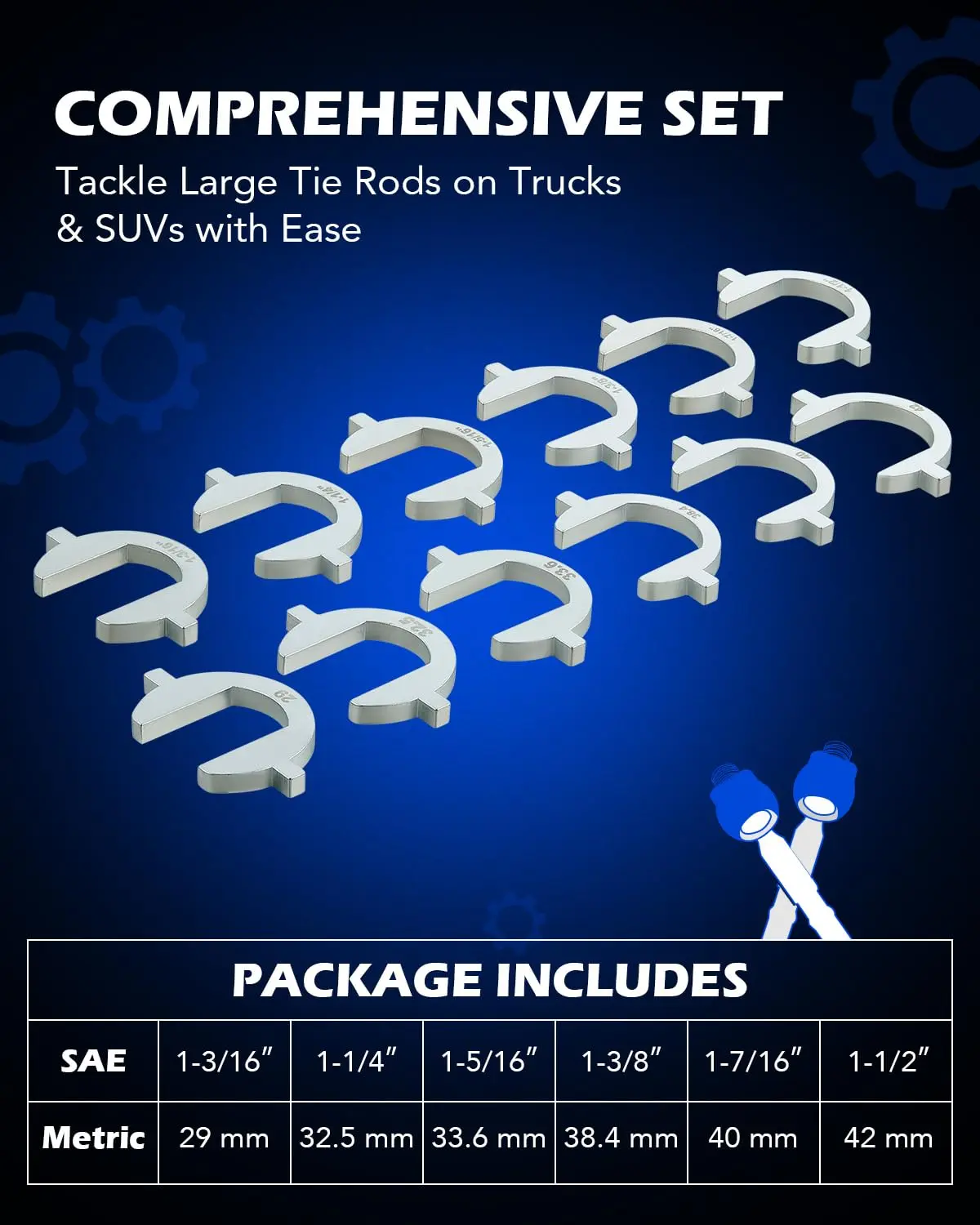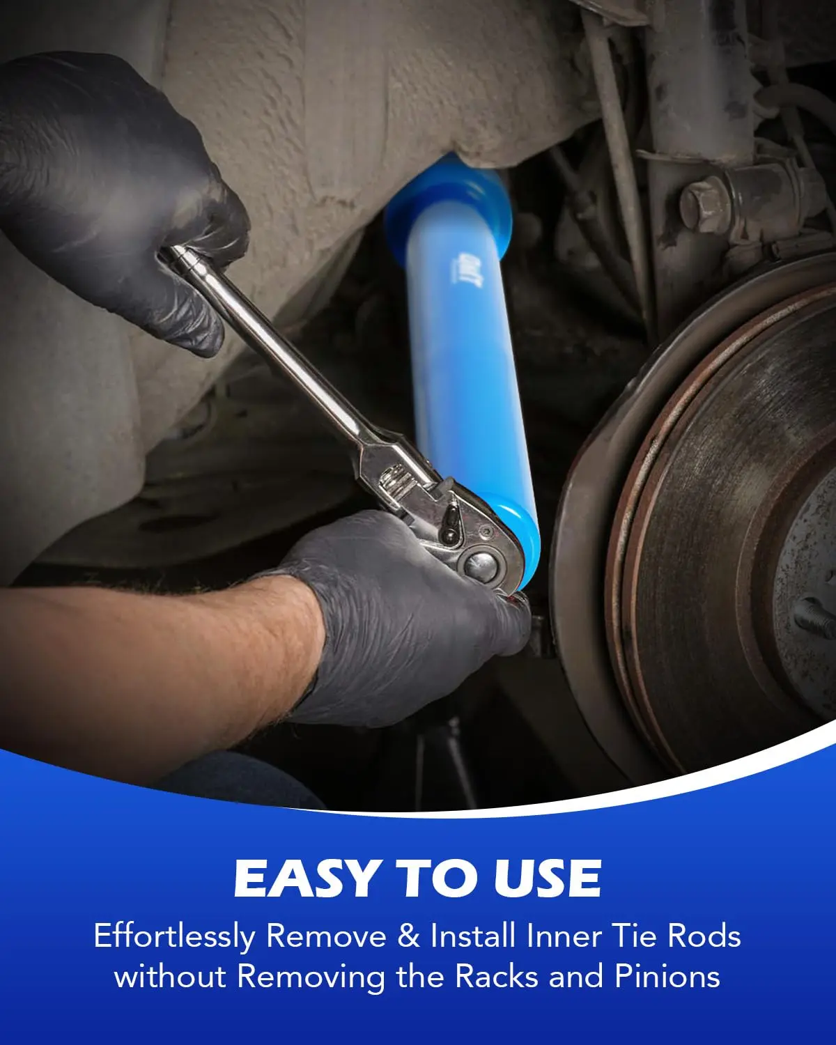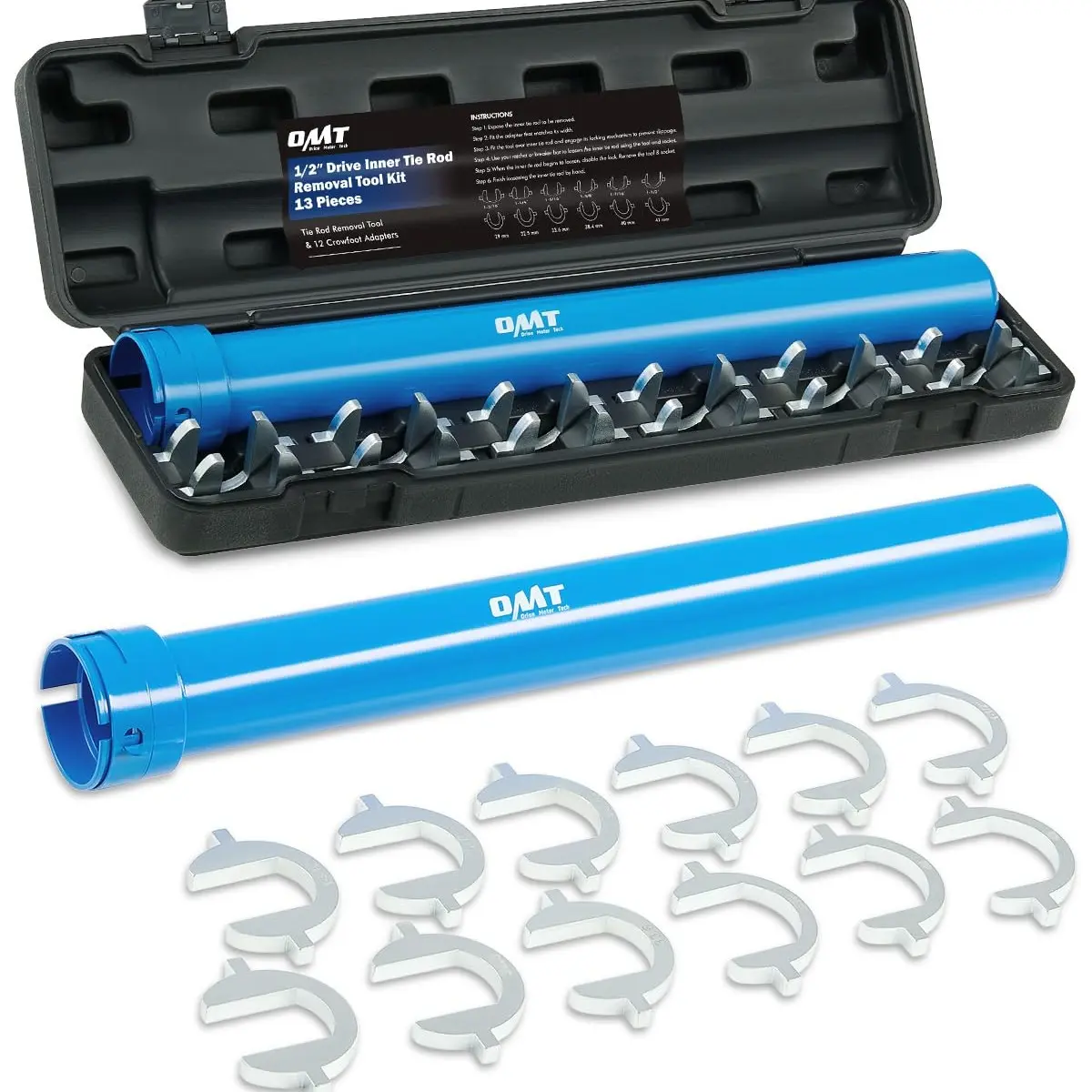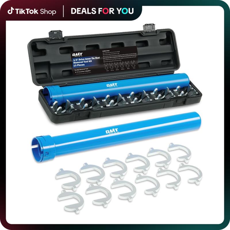 Orion Motor Tech's handy mechanic tool set easily removes & installs inner tie rods without removing the rack and pinion; its 12 crowfoot adapters cover the most commonly needed SAE & metric sizes—1-3/16", 1-1/4", 1-5/16", 1-3/8", 1-7/16", 1-1/2", 29 mm, 32.5 mm, 33.6 mm, 38.4 mm, 40 mm, & 42 mm—to get all your work done quickly and efficiently