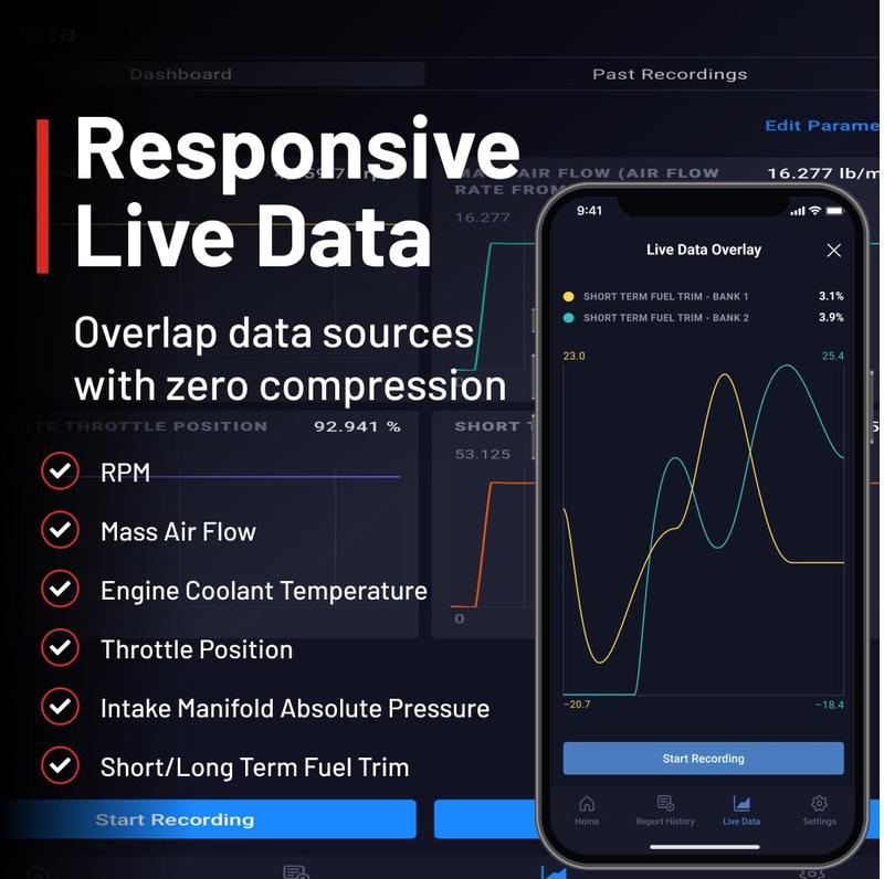Get real-time feedback on your vehicle’s performance. Find out what’s going wrong with a dynamic Y-axis that doesn’t compress over time. Overlay, record, and share feedback. The Innova 1000 supports OBD2 parameters such as RPM, short/long term fuel trim, mass air flow, engine coolant temperature, throttle position, and intake manifold absolute pressure. 📈