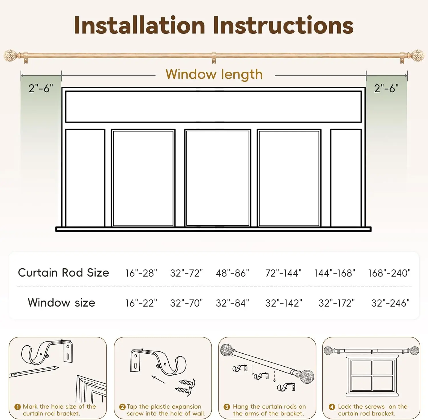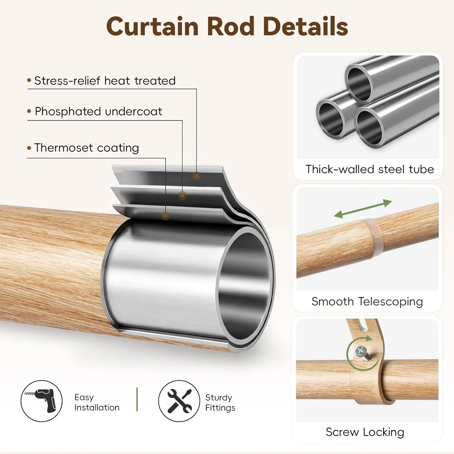 ·EASY TO INSTALL : Includes all necessary hardware and clear instructions for straightforward installation. Each curtain rod is carefully quality-checked to ensure reliable installation and a consistent finish for long-term use.