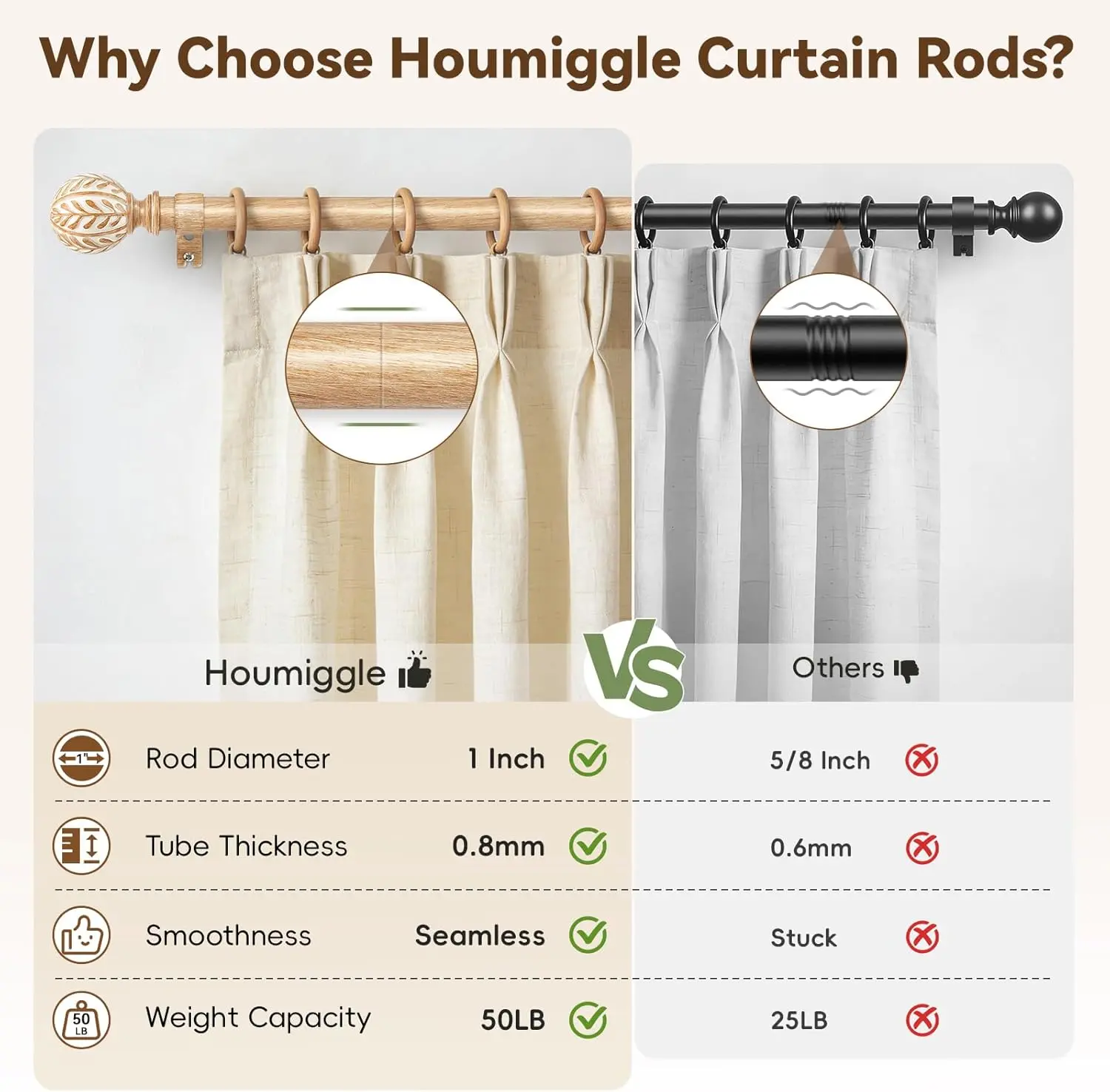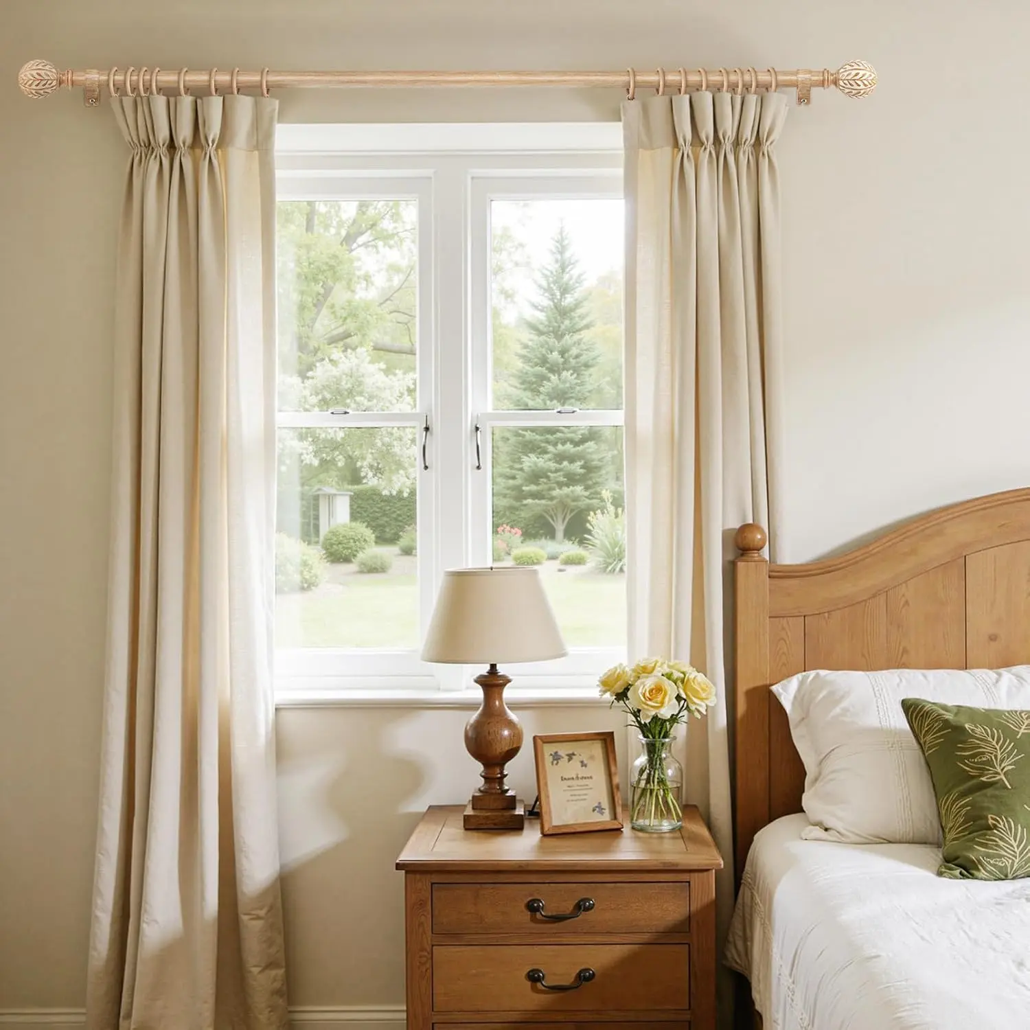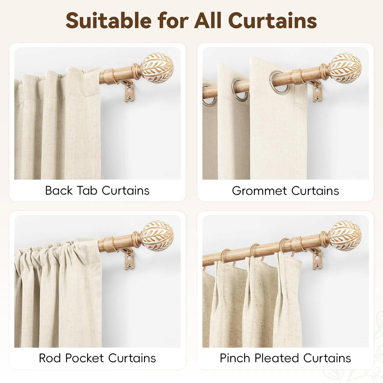 ·IMITATION WOOD GRAIN:Our boho curtain rod features olive leaf–embossed finials paired with a realistic imitation wood grain finish. The natural textures and warm tones add a subtle rustic charm while maintaining a refined, elegant look, designed to achieve a natural wood appearance without the use of solid wood materials.