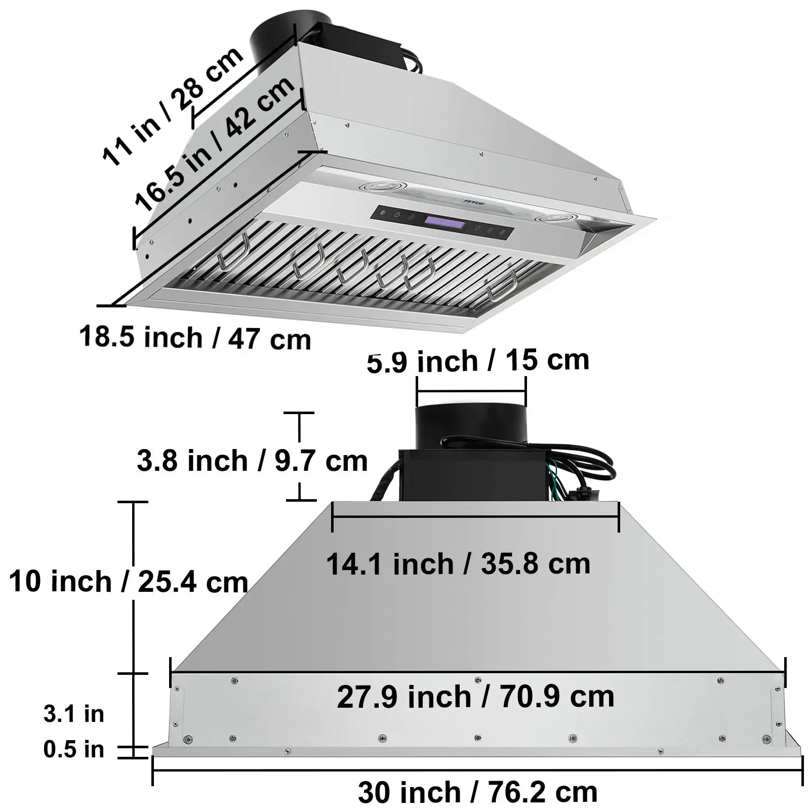 • Ducted/Ductless Convertible:Our insertable kitchen hood is suitable for ducted and ductless kitchens. With an extra 59.1inch / 1.5m detachable duct, fully-filtered fresh air can be circulated indoors or discharged outdoors.