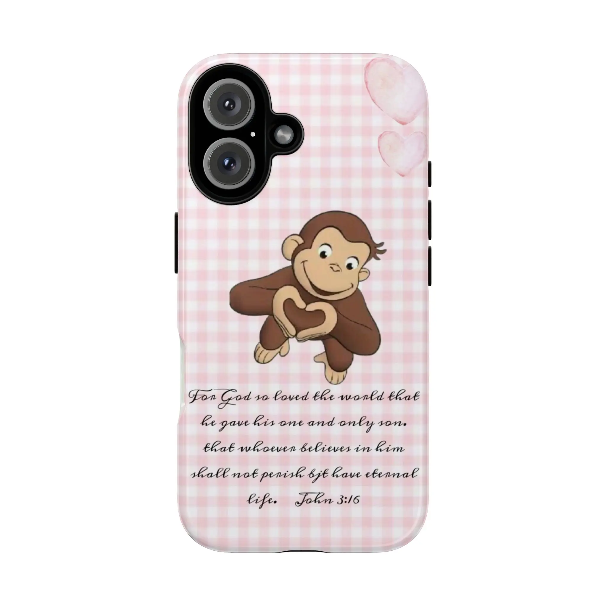Inspirational Bible Verse Phone Case – John 3:16 Scripture with Cartoon Monkey, Curious Georgee Phonecase, Gift for fans
