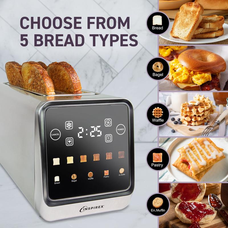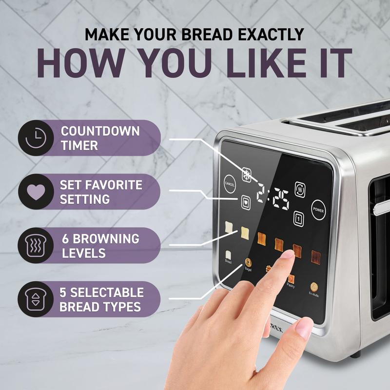 Ergonomic and stylish design with a sleek glass touchscreen plate. This toaster complements a contemporary kitchen aesthetic in any household.