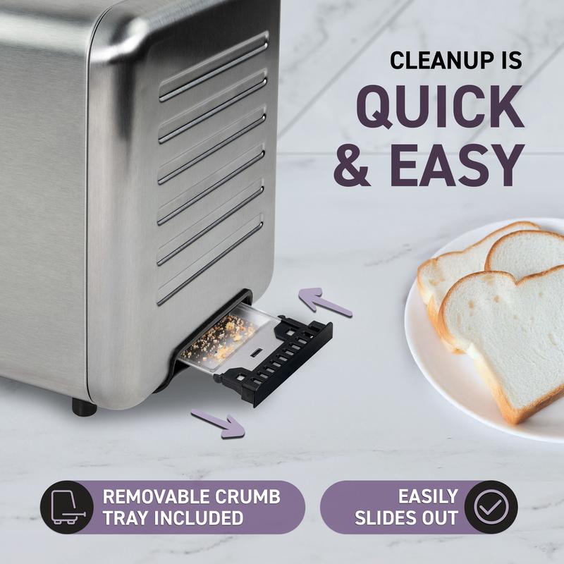 Removable crumb tray included for easy and hassle-free cleanup. Keep your toaster clean with minimal effort.
