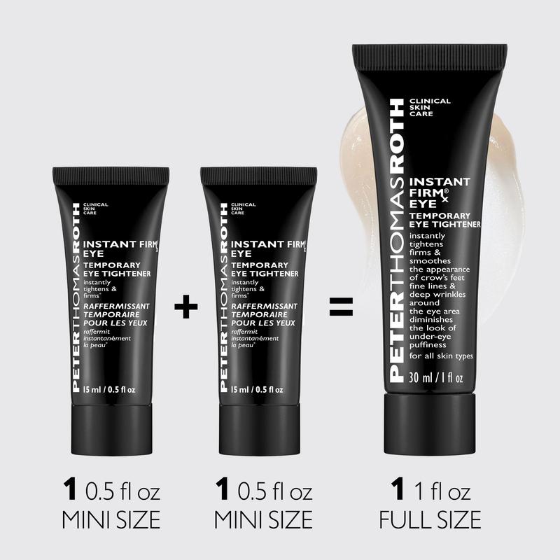 The Peter Thomas Roth Instant FirmX Eye Tightener Bundle includes two 15mL Eye Tighteners. This extra-strength, quick-fix eye treatment helps instantly reduce the look of under-eye bags, puffiness, crow's feet, fine lines and wrinkles for a temporary effect that can last all day. With continued use, this cult-favorite also provides long-term anti-aging benefits. For the best results, please read usage instructions carefully before application!