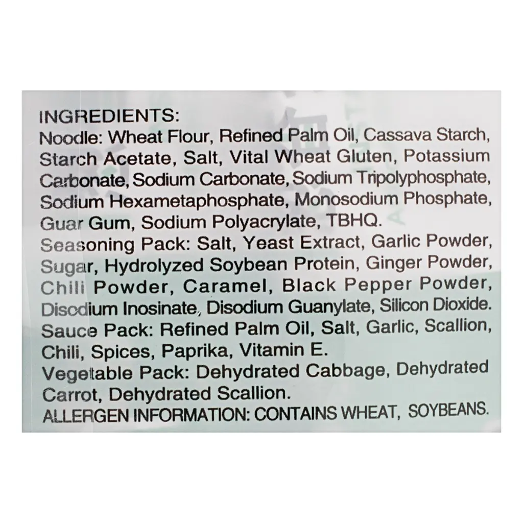 Noodle: Wheat Flour, Refined Palm Oil, Cassava StarchStarch Acetate, Salt, Vital Wheat Gluten, Potassium Carbonate, Sodium Carbonate, Sodium Tripolyphosphate.Sodium Hexametaphosphate, Monosodium Phosphate.Guar Gum, Sodium Polyacrylate, TBHQ.