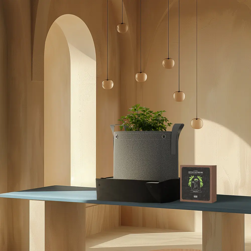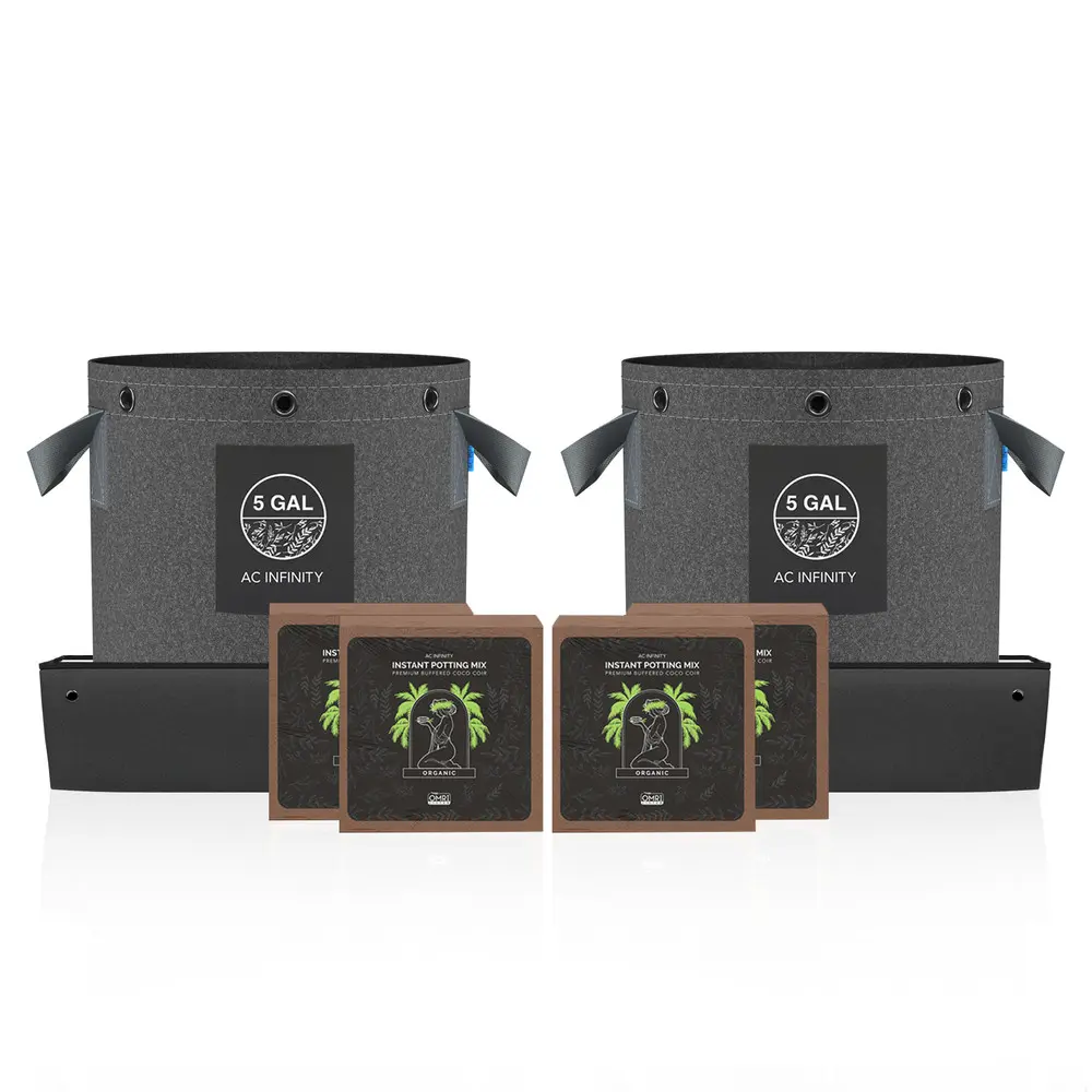 A plant potting kit that includes everything you need to start seeds with a greater success rate. By using this package, you can quickly assemble a seed-friendly environment that will facilitate germination and ensure a successful indoor grow. This bundle includes four bricks of premium buffered coco coir that is 100% organic, two 5-gallon fabric pots, and two waterproof drip trays. Just add water to the coco coir brick and wait up to 30 minutes to get a pH-neutral soil substitute that aids in healthy root development. This substrate can be held in the included 5-gallon fabric pot, made to improve root networks by air-pruning root tips and draining excess water. Place the fabric pot in the multipurpose tray that can be used as a hydration chamber to expand the coco coir while keeping your grow space tidy.