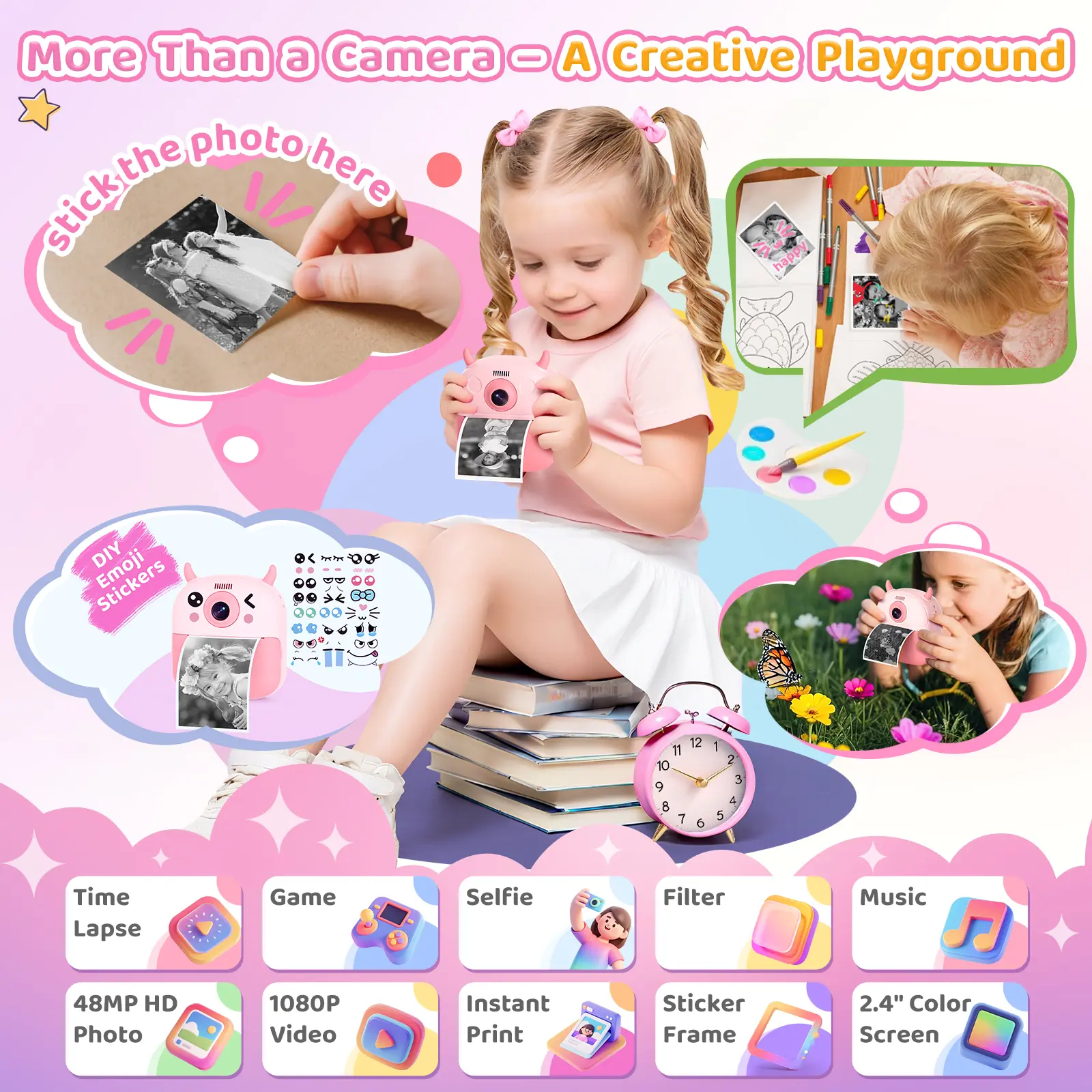 ·All-in-One Creative Hub for Kids: More than just a camera, this is a portable creative studio. It features a 2.4-inch large screen for easy framing, 1080P video recording, time-lapse, continuous shooting (3/5-shot burst), built-in games, fun filters & frames, and even an MP3 player. Designed to grow with your child, it satisfies their evolving creative needs and makes for a wonderful companion, capturing happy moments and bringing the whole family together.