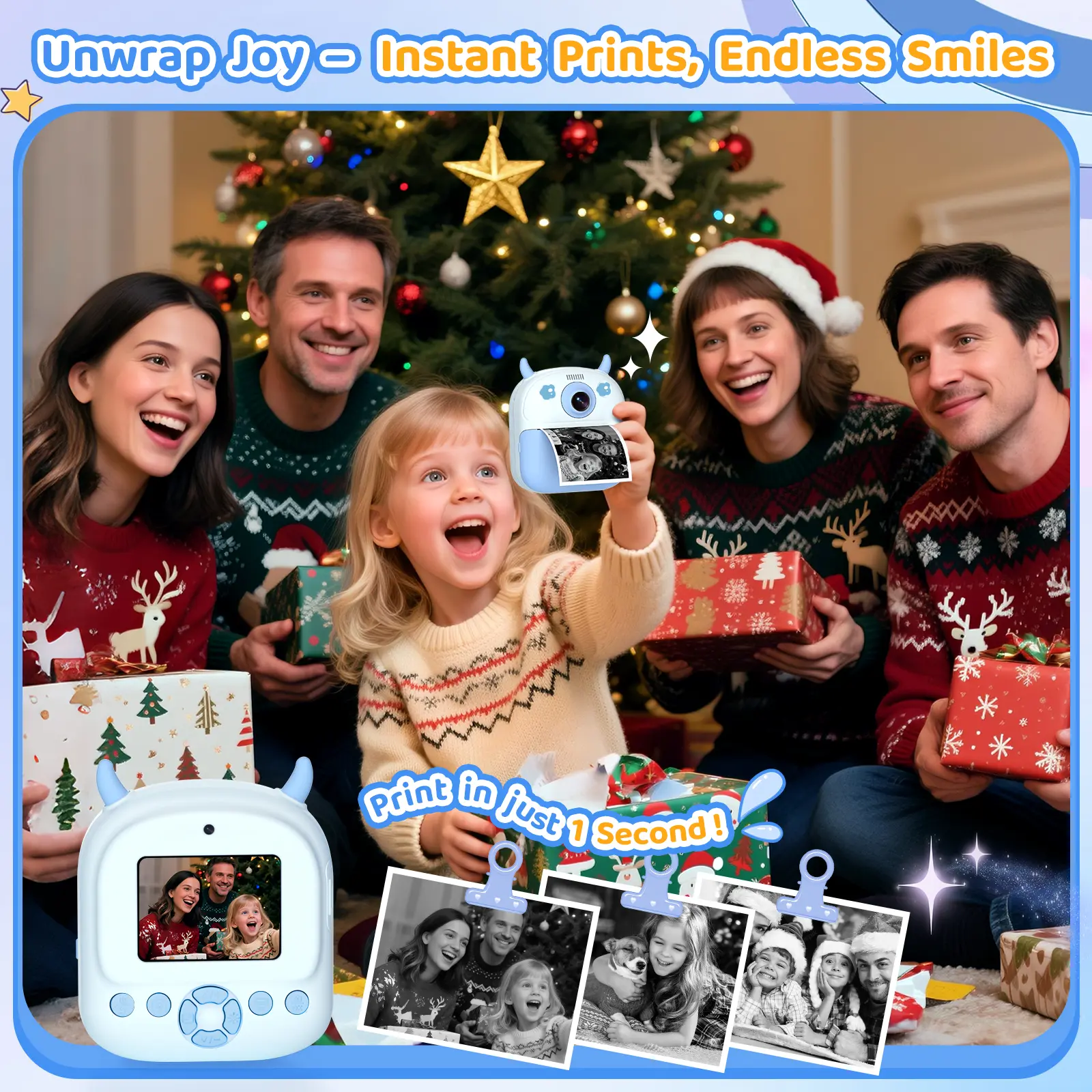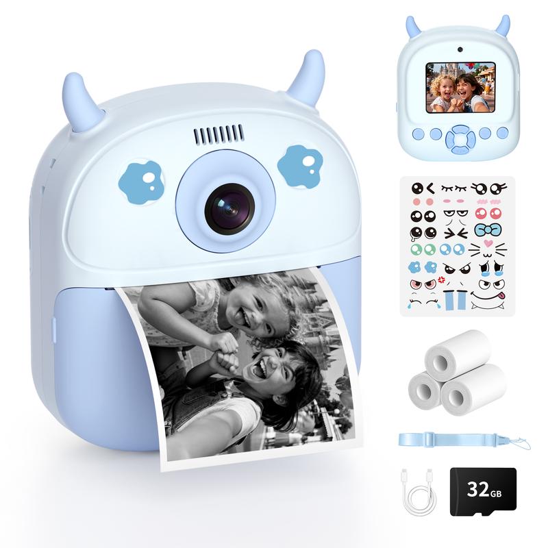 ·Instant Print & Dual Storage for KidsThis kids instant camera prints a black-and-white photo about 1 second after the shutter is pressed. At the same time, a full-color version is saved to the SD card for long-term storage. The camera includes 7 scene filters and 22 built-in stickers, allowing children to decorate their photos directly. The package comes with 3 rolls of thermal paper: 2 standard rolls (approximately 58 prints per roll) and 1 adhesive-backed sticker roll, providing up to 174 total prints for drawing, labeling, and creative play.