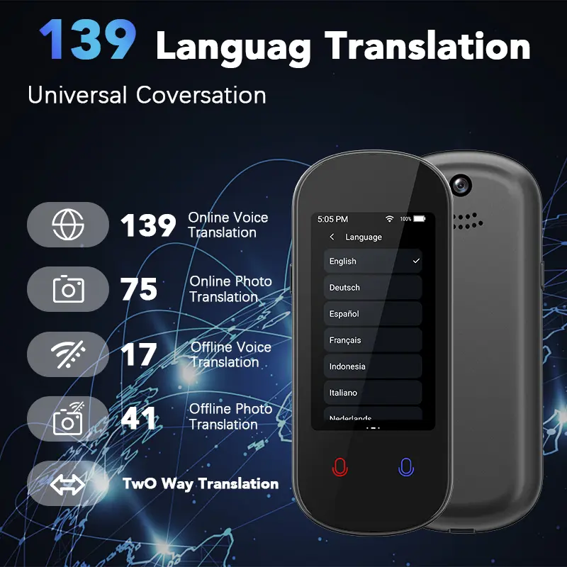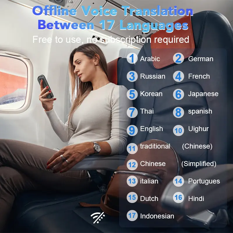 Offline Translation- Provides 17 free offline language translations: English, Spanish, Mandarin Chinese, Traditional Chinese, Japanese, Korean, German, Russian, French, Thai, Arabic (Saudi), Italian, Portuguese, Dutch, Indonesian, Hindi. Communicate confidently anywhere. Note that 5 languages require downloading language packs beforehand. Refer to the user manual for details.