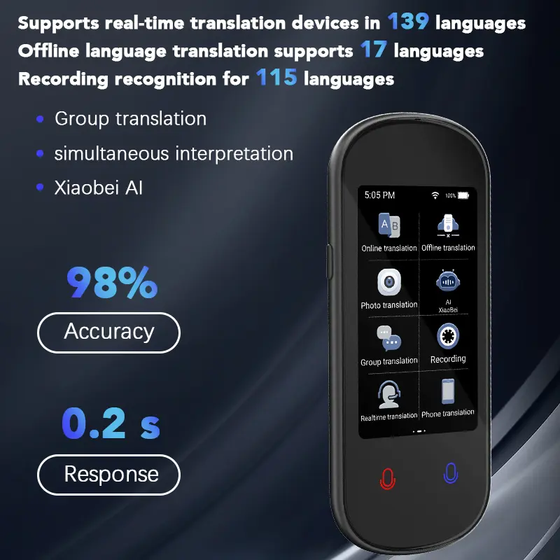 Instant Voice Translation With simultaneous interpretation, you can understand and be understood by anyone. Immerse yourself in the conversation with our instant offline language translation device. The language translation device can also convert the recording to text and translate it into other languages at the same time.