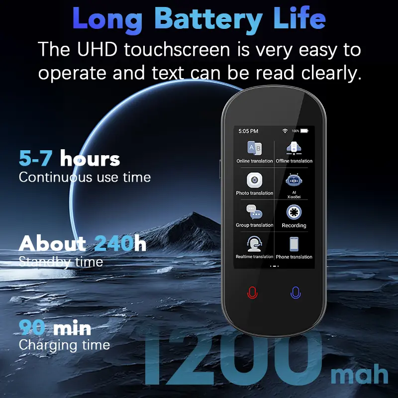 CONVENIENT AND RELIABLE We understand the importance of portability, which is why our translate device is designed to be lightweight and easy to carry. With its built-in 1200mAh battery, you can enjoy up to 8 hours of continuous use and up to 7 days of standby time. Whether you're on a business trip or exploring a new country, this device will be your most reliable language companion.
