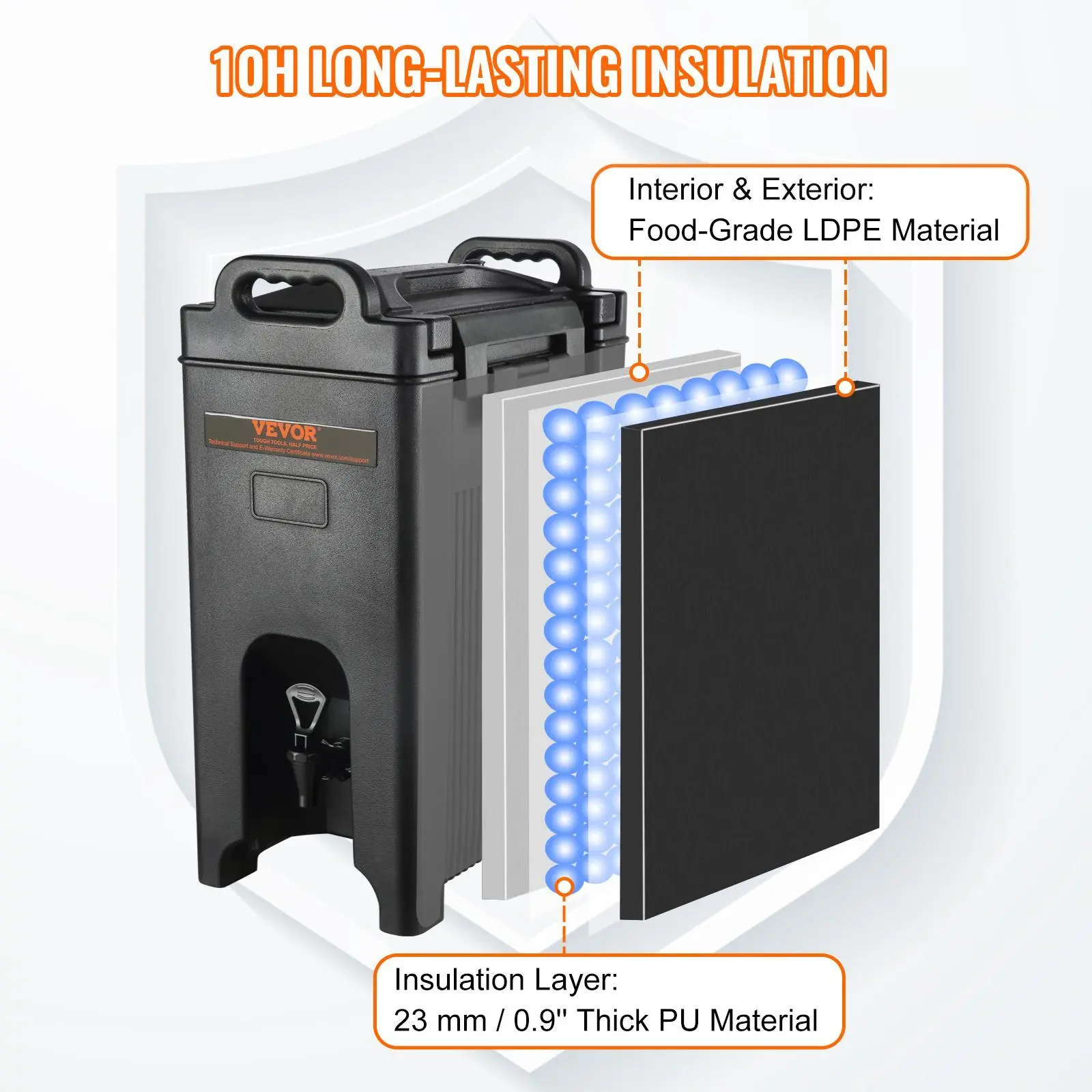 • Non-Electric Insulation: Crafted with an LDPE surface and a 0.9 in (23 mm) PU foam layer, our hot and cold beverage dispenser is your go-to for exceptional insulation. It keeps your drinks at the ideal temperature for over 10 hours without requiring electricity or any external power source. The two integrated nylon latches securely tighten the lid, locking in the desired internal temperature.