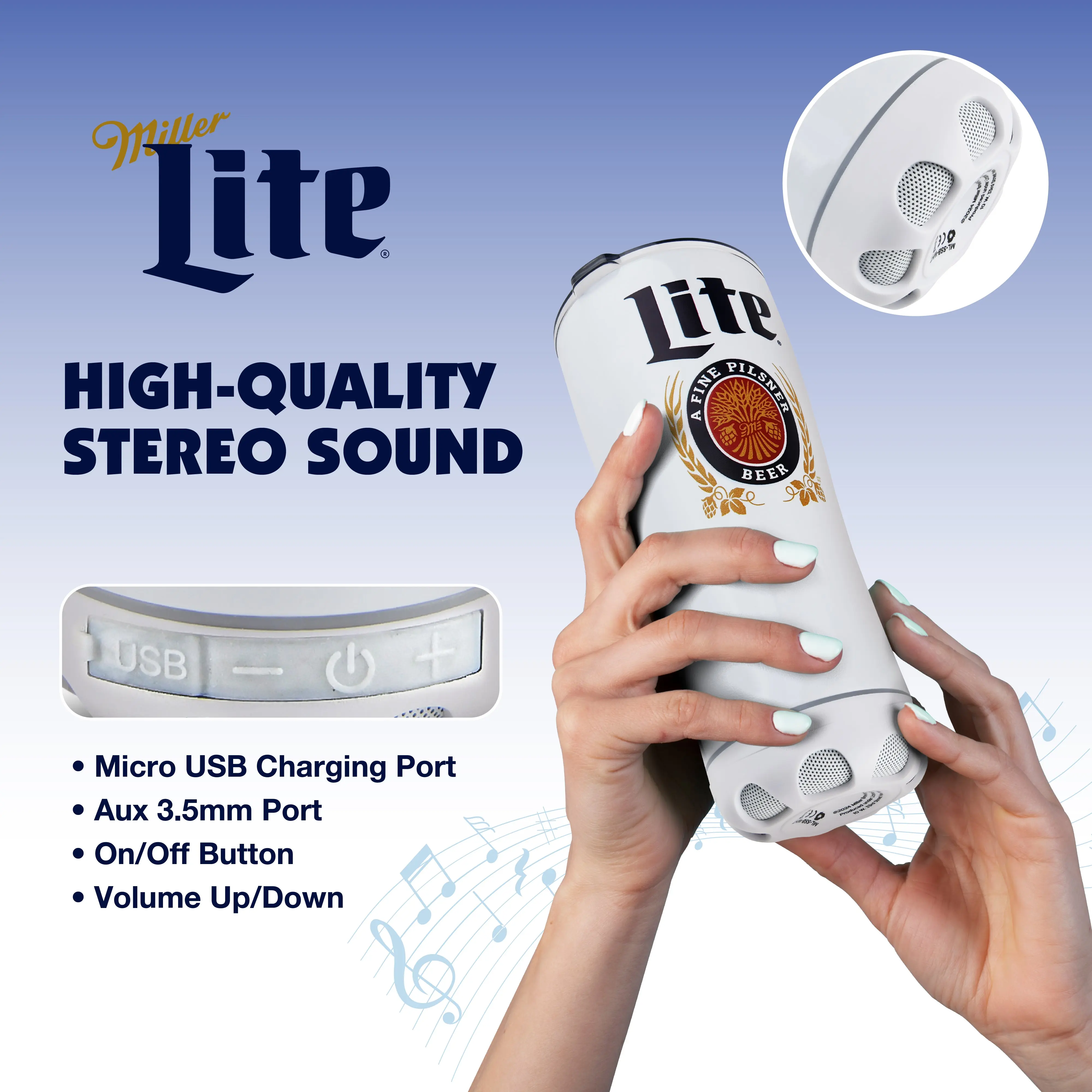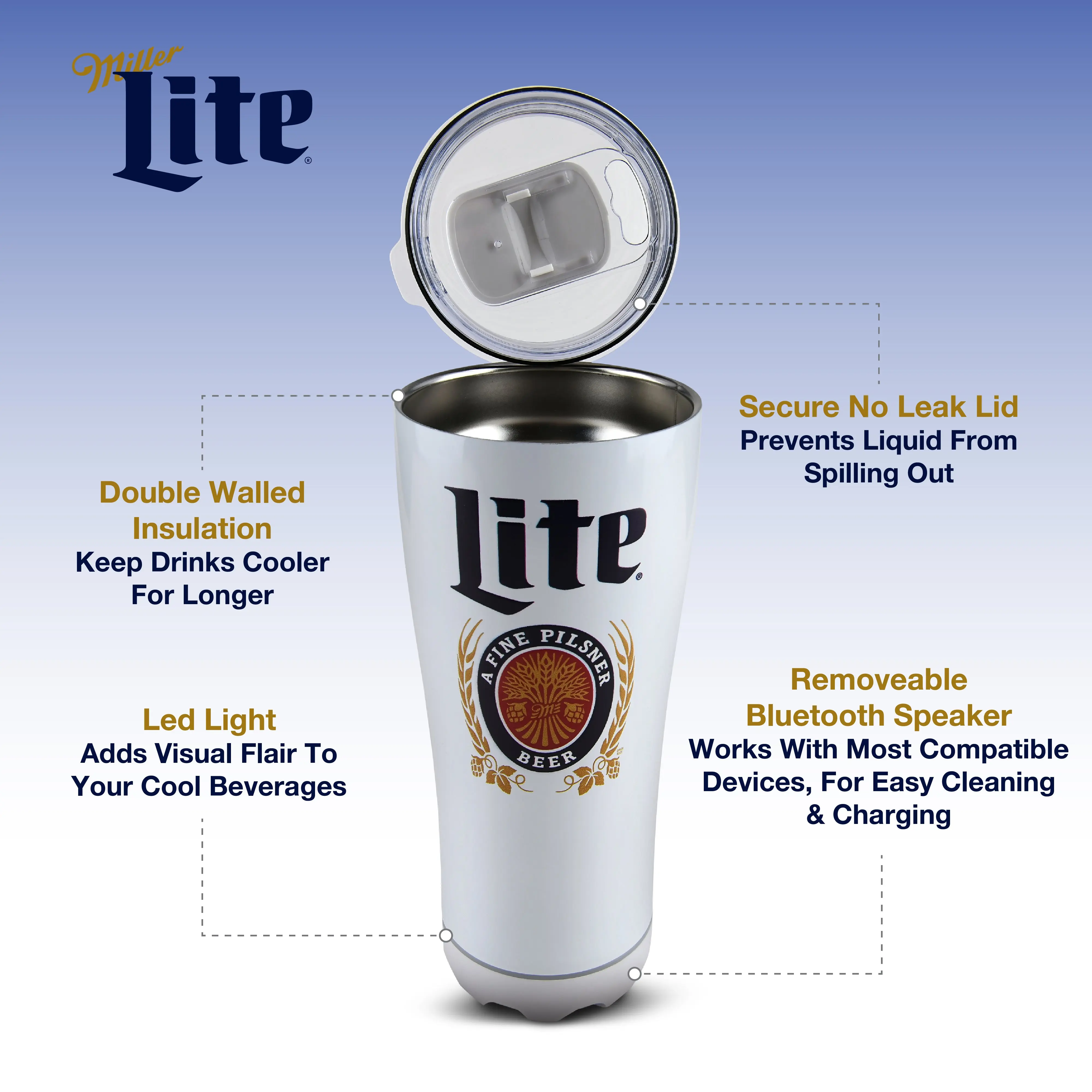 Enjoy your favorite tunes and beverages with the Miller Lite and Coors Light Insulated Bluetooth Speaker Tumbler. This unique tumbler combines a high-quality insulated drink container with a Bluetooth speaker, letting you keep your drink cold and the music playing, all in one stylish accessory. Perfect for outdoor gatherings, tailgates, or a day at the beach, the tumbler’s double-walled insulation keeps your drink at the ideal temperature, while the built-in Bluetooth speaker provides crisp, clear audio for hours of enjoyment. With easy Bluetooth pairing, you can connect your phone or other devices in seconds, allowing you to relax with your favorite songs wherever you go. Show off your love for Miller Lite or Coors Light with this all-in-one speaker tumbler, designed to make any event more enjoyable!