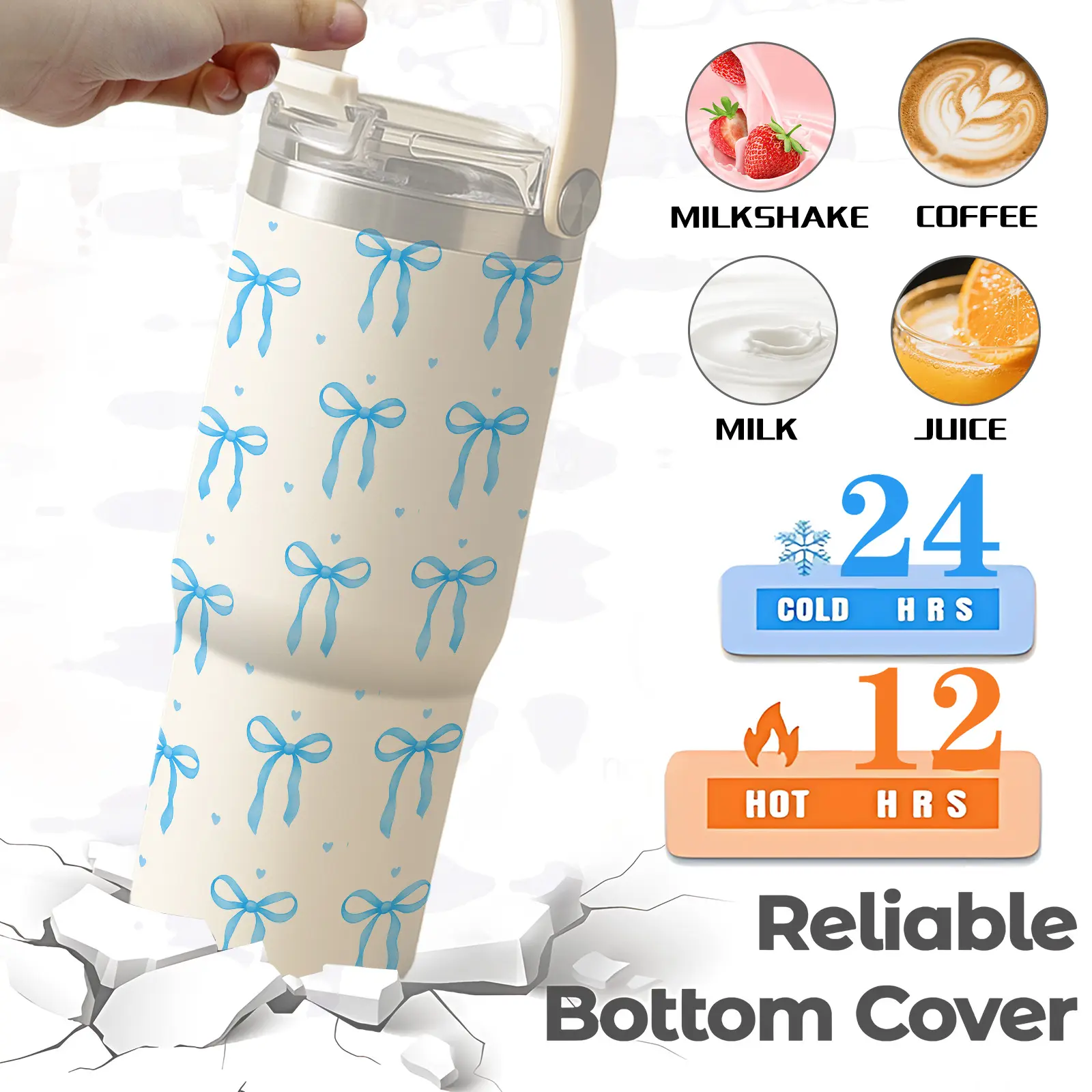 1 Pc 30oz insulated mug with handle and straw, Tumbler, cream white with blue bow design, double wall vacuum cup, leak-proof skinny thermal mug, keeps hot 12 hours and cold 24 hours, perfect for coffee tea smoothies cocktails, holiday gift