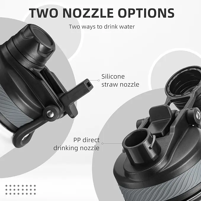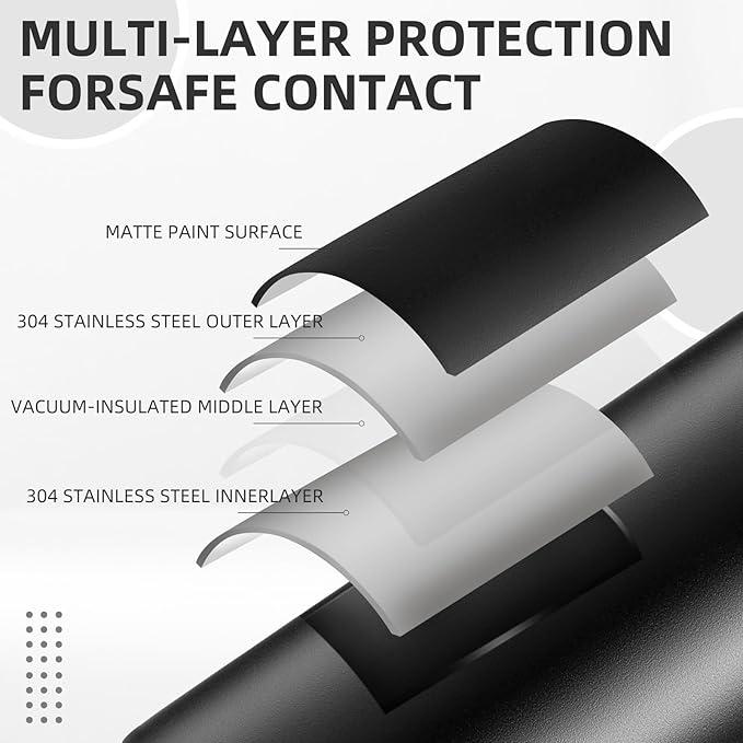 ·SAFETY & DURABLE: Our water flask main crafted from premium food-grade 304 stainless steel, and the lid is made of food-grade silicone and PP material.More safer to use, which is also extreme durable and rust-free.Its powder coating finish provides enhanced grip, while the wide-mouth opening facilitates effortless ice filling and swift cleaning.