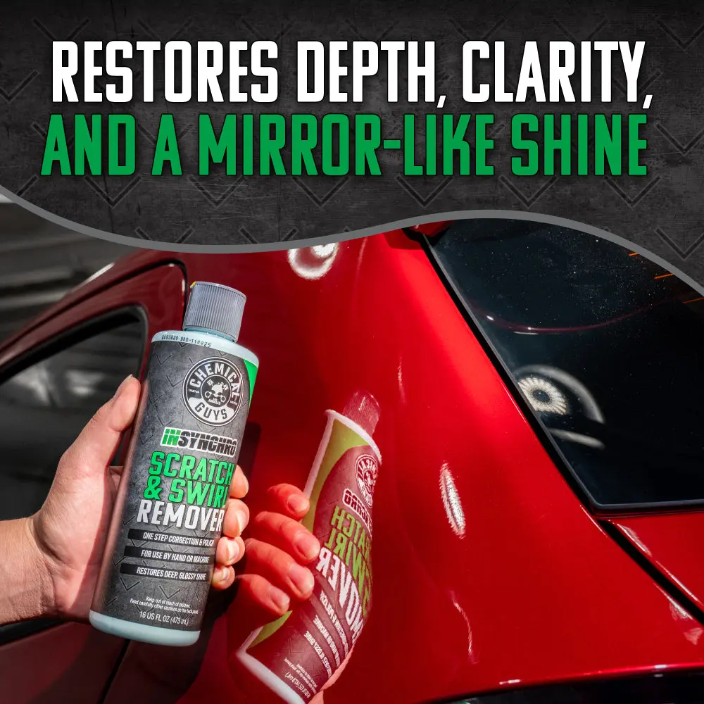 InSynchro Scratch & Swirl Remover’s one-stop formula corrects light to medium scratches, swirls, water spots, and other paint defects while restoring clarity, gloss, and depth. Its adaptive micro-abrasives diminish in size as you work, delivering powerful correction and a deep, glossy finish all in one, easy-to-use product.