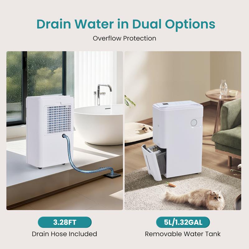 ·Easy To Use: Auto Drain - The unit comes with a 6.56 feet drain hose that you can attached to the drain pipe hole to continually drain water that is dehumidified. Manual Drain - The water tank is 0.66 gallon/2.5 L,when it reaches maximum capacity, the "Full Tank "indicator will light up, the dehumidifier will automatically switch off until the tank has been emptied. Meanwhile, a reusable and washable filter preserves fresh and clean air quality