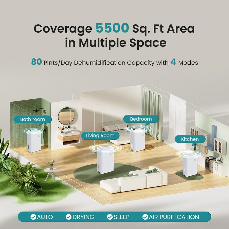 ·Dehumidifier for Space Up to 2000 Sq. Ft: Our dehumidifiers, certified with the 2025 Energy Star, are able to remove up to 34 pints (under 95°F, 90%RH condition) of moisture per day in areas up to 2000 Sq. Ft and adjust humidity from 30% to 80%. It is an energy-efficient dehumidifier ideal for basements, offices, homes, bathrooms, bedrooms, kitchens, stockrooms, living rooms, laundry rooms, cellars, crawlspaces, etc.