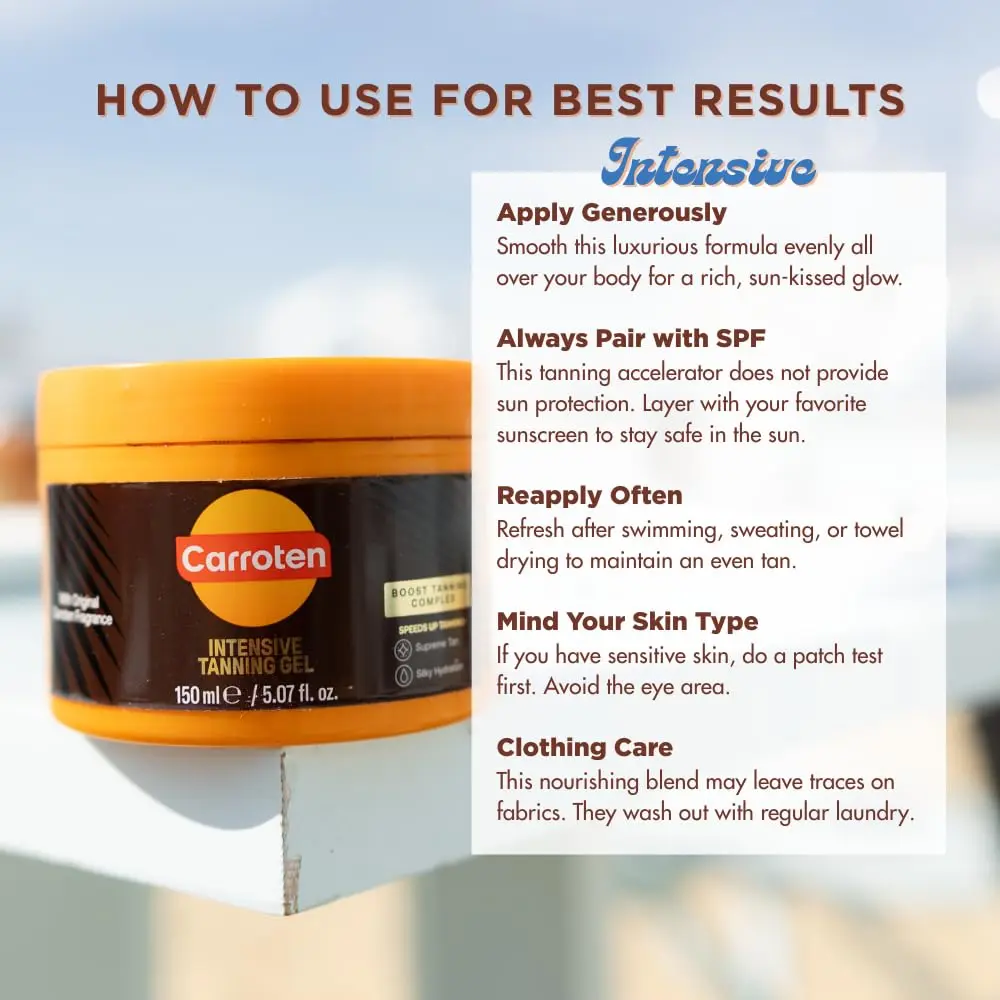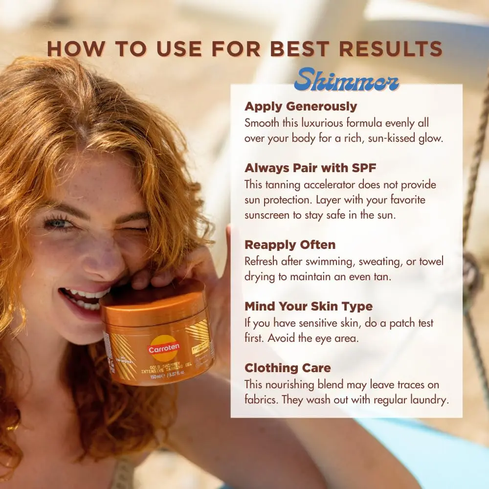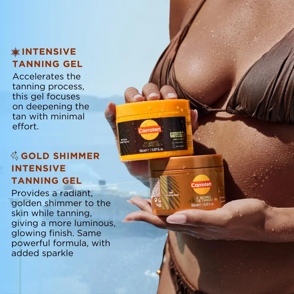 ·Instant Sun-Kissed Glow: Achieve a flawless, even tan instantly with the original Carroten Intensive Tanning Gel. For an added radiance, choose the Gold Shimmer Tanning Gel, the same powerful formula, enhanced with light-reflecting shimmering pearls that highlight your skin with a subtle sparkle.