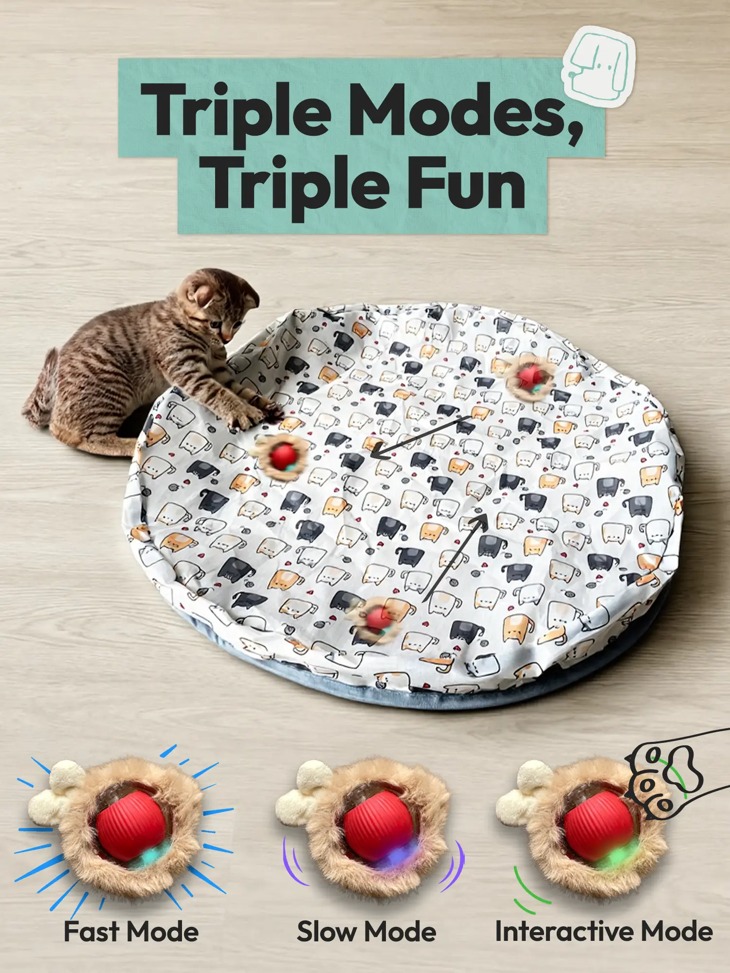 ·【Three Play Modes】Hold the power button for 2 seconds to turn the kitten toys on or off. Click the button to switch between modes—Fast Rolling (Blue Light), Back-and-Forth Rolling (Purple Light), and Interactive Mode (Yellow Light). You can easily adjust the settings to fit your cat’s personality and age.