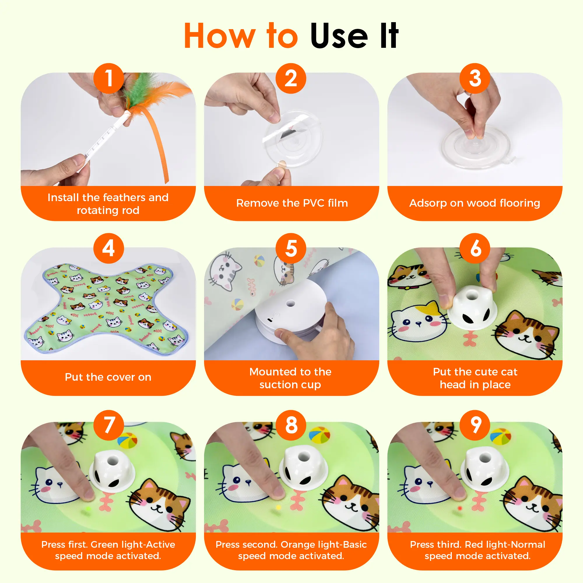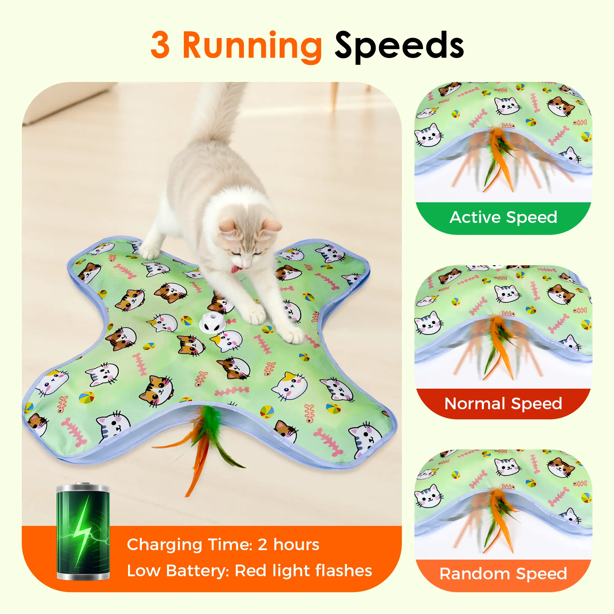 ·Multi Modes for Indoor Fun:Simply press the button to switch speeds effortlessly: High speed mode - green light, low speed mode - yellow light, random speed mode - red light. The automatic cat toy boasts versatility with a removable lid. When your cat loses interest in the lid, you can remove it entirely, revealing the exciting feather wand on the rotating rod! This dynamic movement will attract your cat to pounce and bat at the fluttering feathers, adapting to a variety of cat play styles.