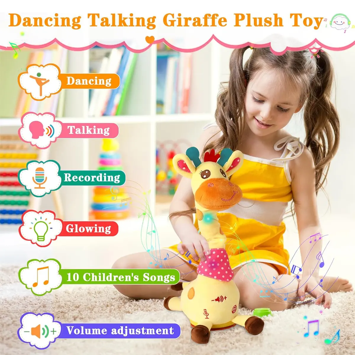 【Talking and Dancing Giraffe】Our baby dancing toy features an irresistible giraffe design that will capture children's attention. It shares the same functionality as the dancing cactus, singing 10 nursery rhymes, swaying its body to dance, and equipped with LED lights.