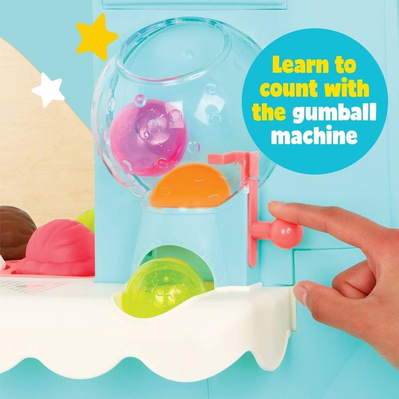 •Fun Features: Explore the light-up tablet, use the ice cream topping dispenser, play a shape sorting game with the popsicles, practice counting with the gumball machine, honk the horn, and much more!