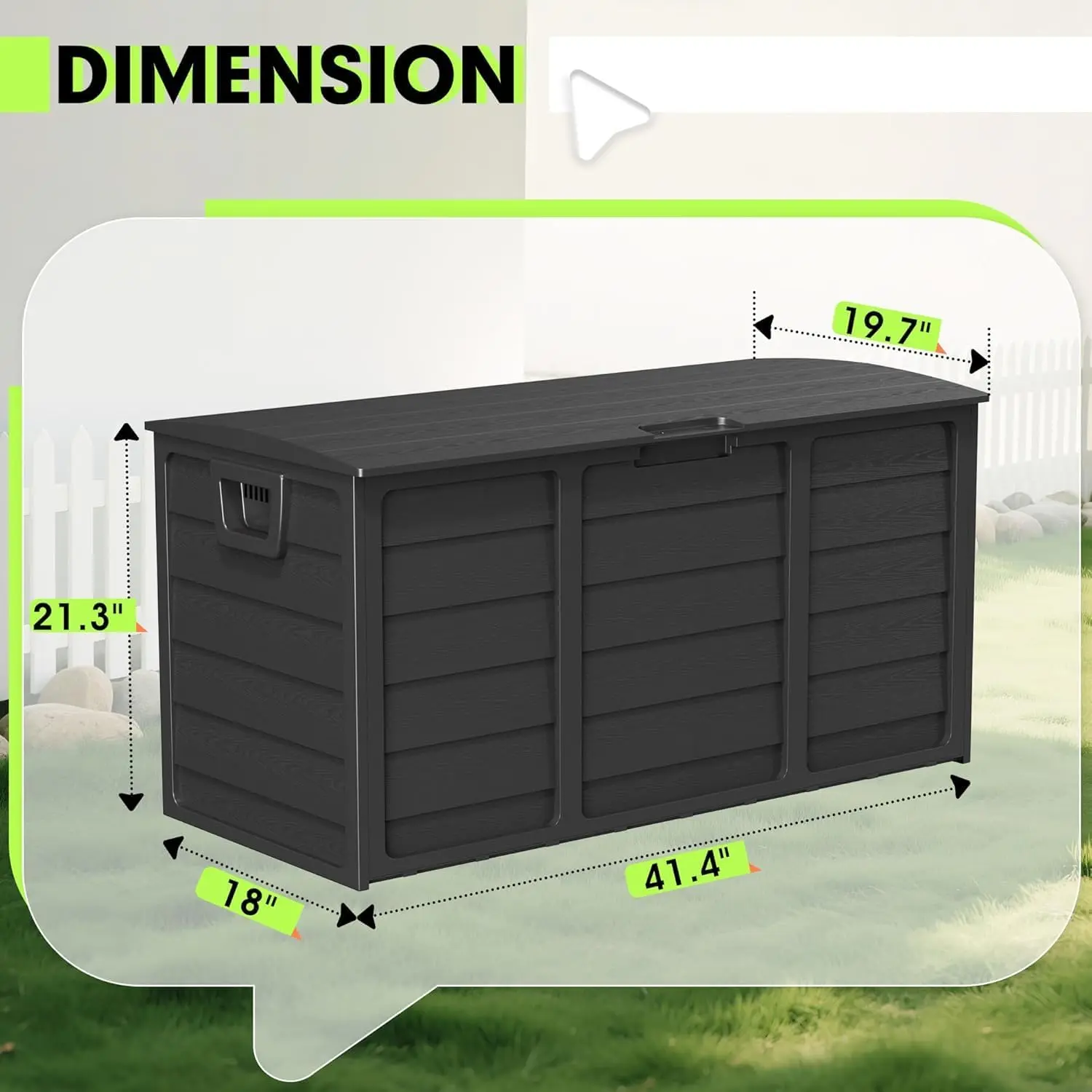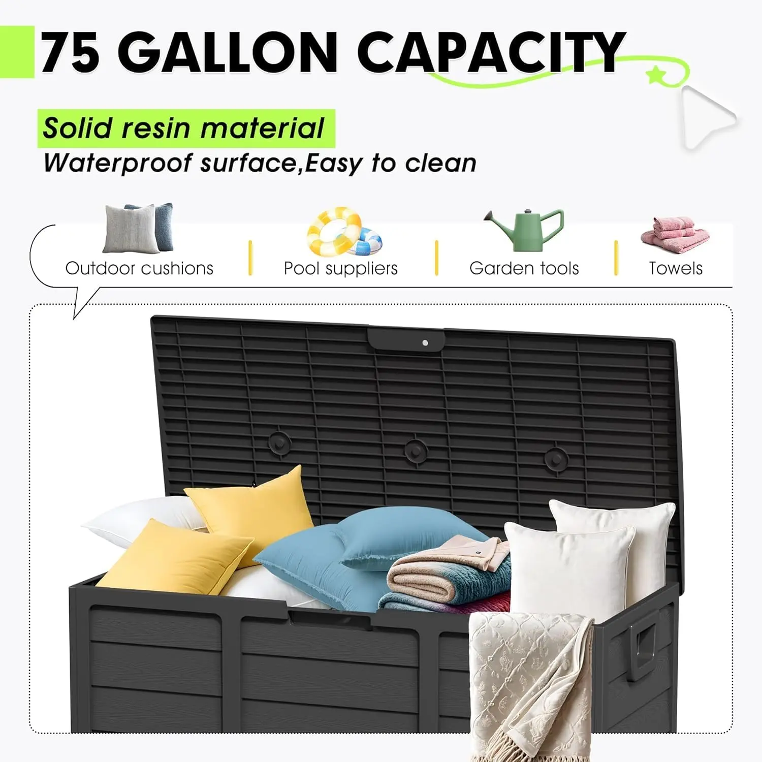 ·【Large capacity】The 75 gallon deck box offers an extremely large storage space, measuring 41.4 inches in length x 18 inches in width x 21.3 inches in height. It can easily hold a variety of items such as cushions, garden tools, beach towels, and outdoor equipment, effectively keeping the courtyard, pool area, and lawn tidy and orderly.