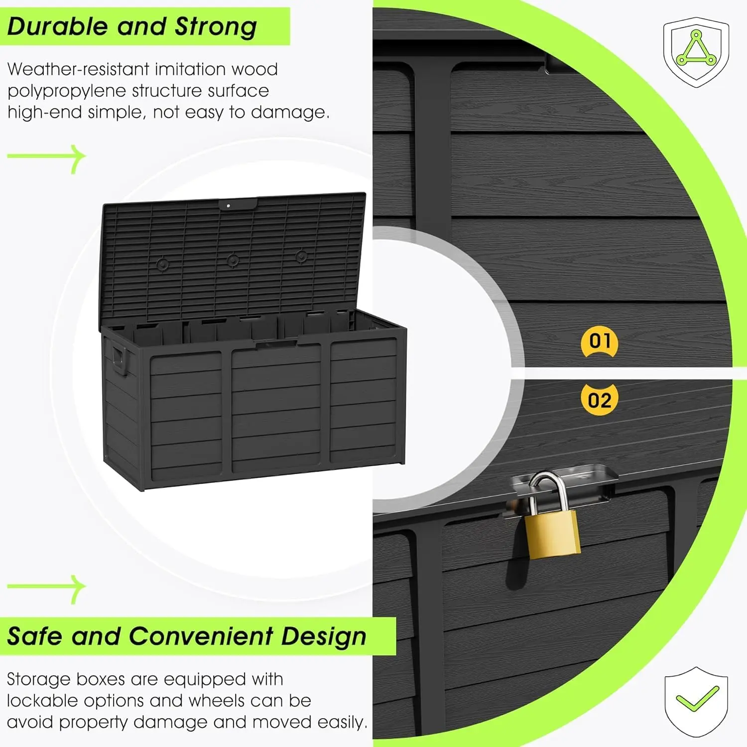 ·【Safe and Convenient design】The lid of the outdoor storage box is designed with lockable holes (Note: Locks need to be purchased separately), effectively preventing property damage and animal entry, and ensuring the safety of stored items. The box is equipped with built-in handles on both sides, allowing users to easily lift, drag and move the box, achieving barrier-free transportation and flexible placement.